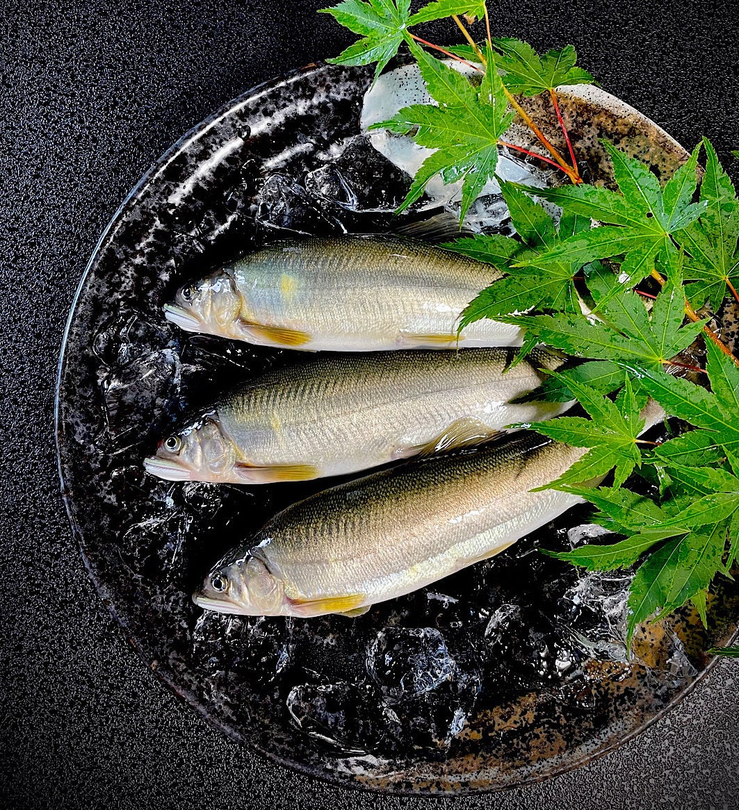 鮎の生産者としては生産量は多い方ではありませんが、鮎にストレスを与えない環境に気を配り、河川放流する鮎と店舗で提供する鮎をのびのびと育てています。
