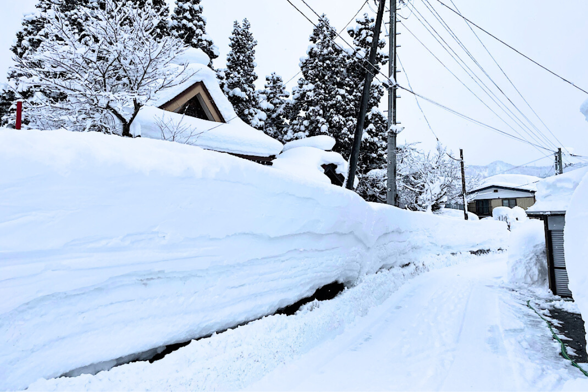 山と川に挟まれた地形に位置することから、豪雪で全国的に有名な秋田県横手市よりも積雪量が多く、多い時で積雪が2メートルを超えるときもあります。そのため、朝晩2時間程度の重機での除雪が日常となります。町も静まり返り、人の気配が感じられなくなります。