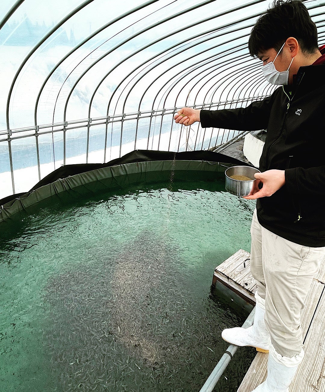 無事に入荷した後も、少しの変化でも死んでしまう繊細な鮎なので気を抜けません。小鮎の時期はしっかり食べられているか、運動は足りているか確認しながら毎日3回手作業で餌を食べさせます。30万匹に及ぶ鮎に全て餌をあげるのに毎回1時間ほどかけて全ての鮎に目が行き届くようにしています。雪深い秋田、雪解けまではハウスの中で、水温水量ともに鮎にとって好条件の恵まれた地下水で育てています。