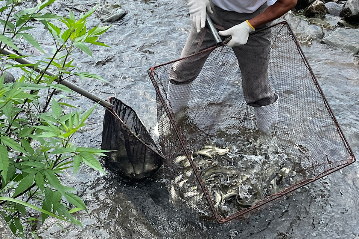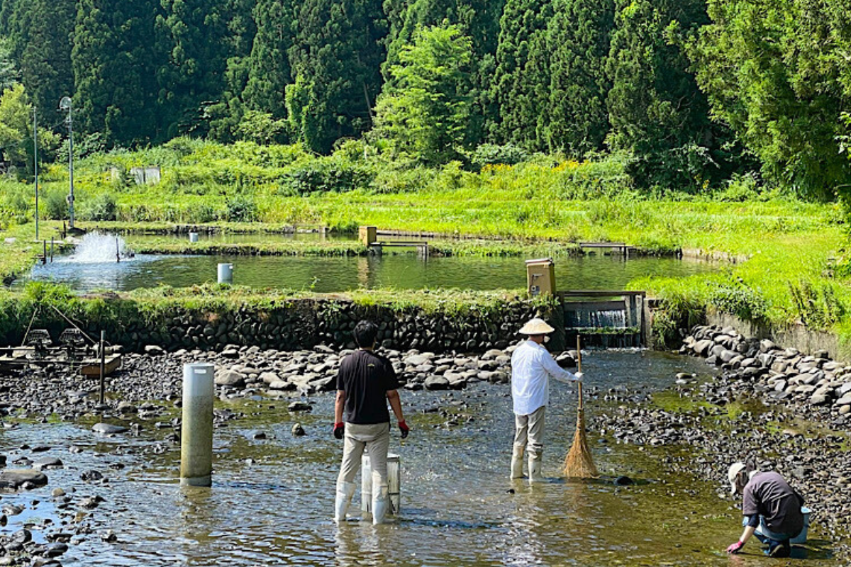 秋田県では天然鮎の減少に伴い、資源確保のためにも養殖した鮎を各河川の漁協組合で遊漁用に放流しています。秋田県内には鮎の養殖事業者が3つあり、鮎乃家はその1つです。鮎乃家では毎年1トン以上の鮎を地元の河川から100キロ離れた河川まで、計5つの河川に放流しています。