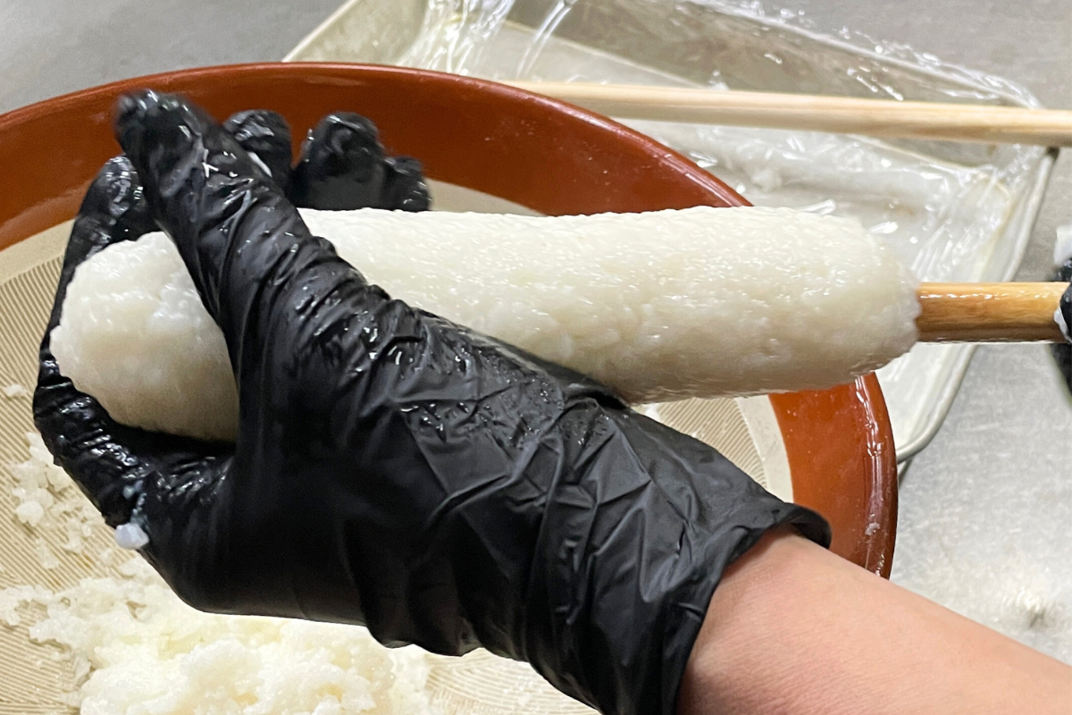炊いたお米を熱いうちに半殺しといわれる半分すりつぶした状態にします。粘り気が強いため一人はすり鉢を持ち、一人はすりこぎで押しつぶす、2人がかりの作業です。これが相当な重労働、お米は固すぎても柔らかすぎてもダメなのでその加減も地元のお母さんたちの熟練の技が光ります。