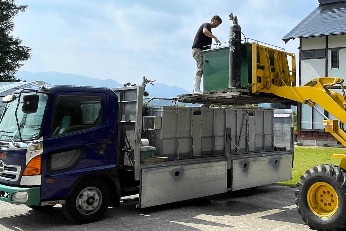 鮎は大変デリケートな魚なので、輸送には気を使います。放流前日から水温、酸素、餌を管理し、4トントラックでの輸送もできる限り水槽内を揺らさず鮎が傷つかないように心がけています。