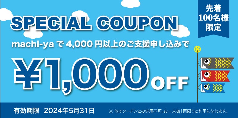 machiyaで使える、先着100名様限定のクーポン配布中。支援を迷っていた方はおトクなこの機会にぜひ!