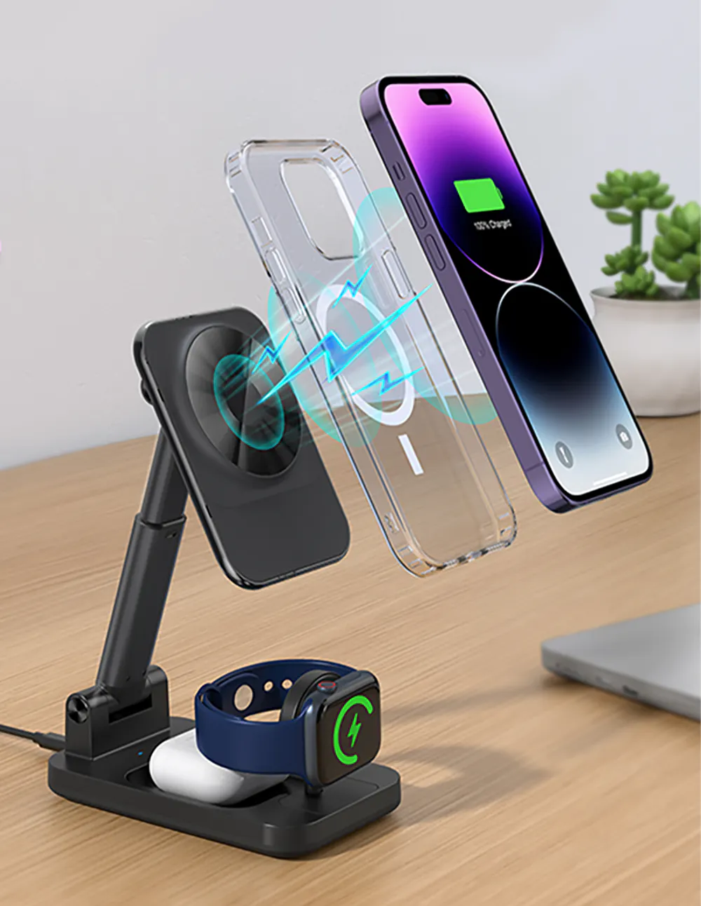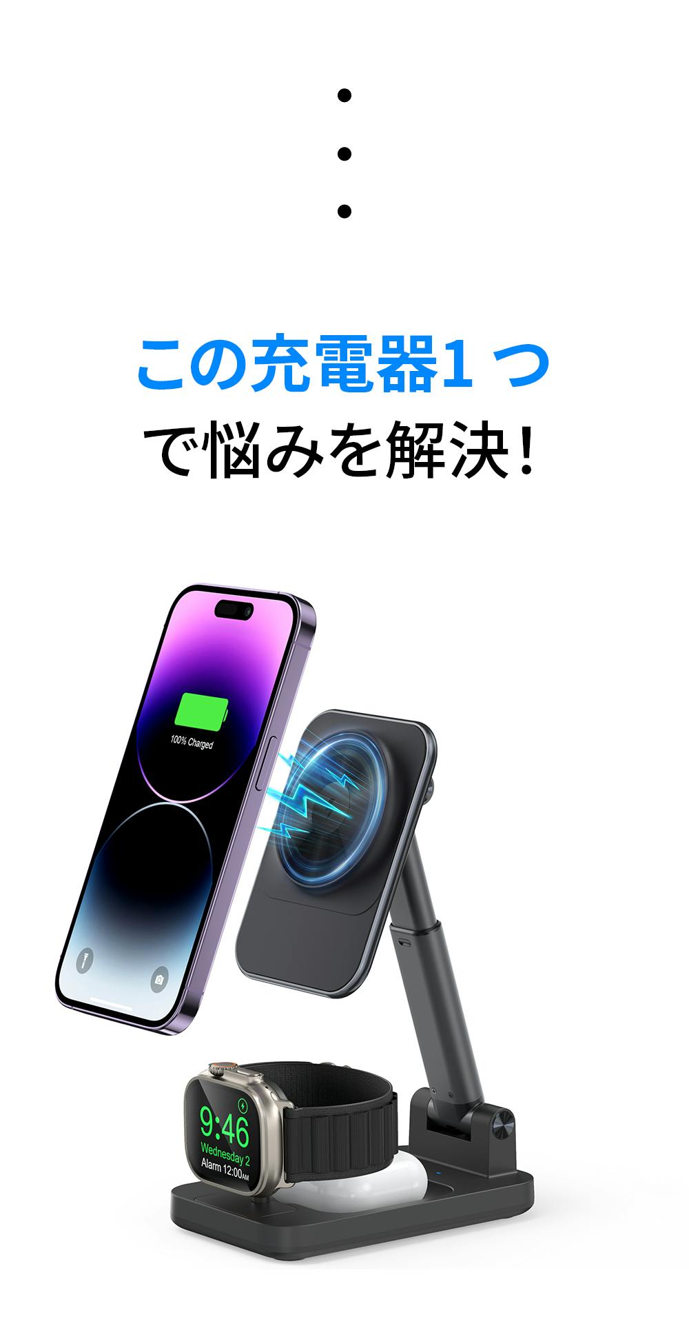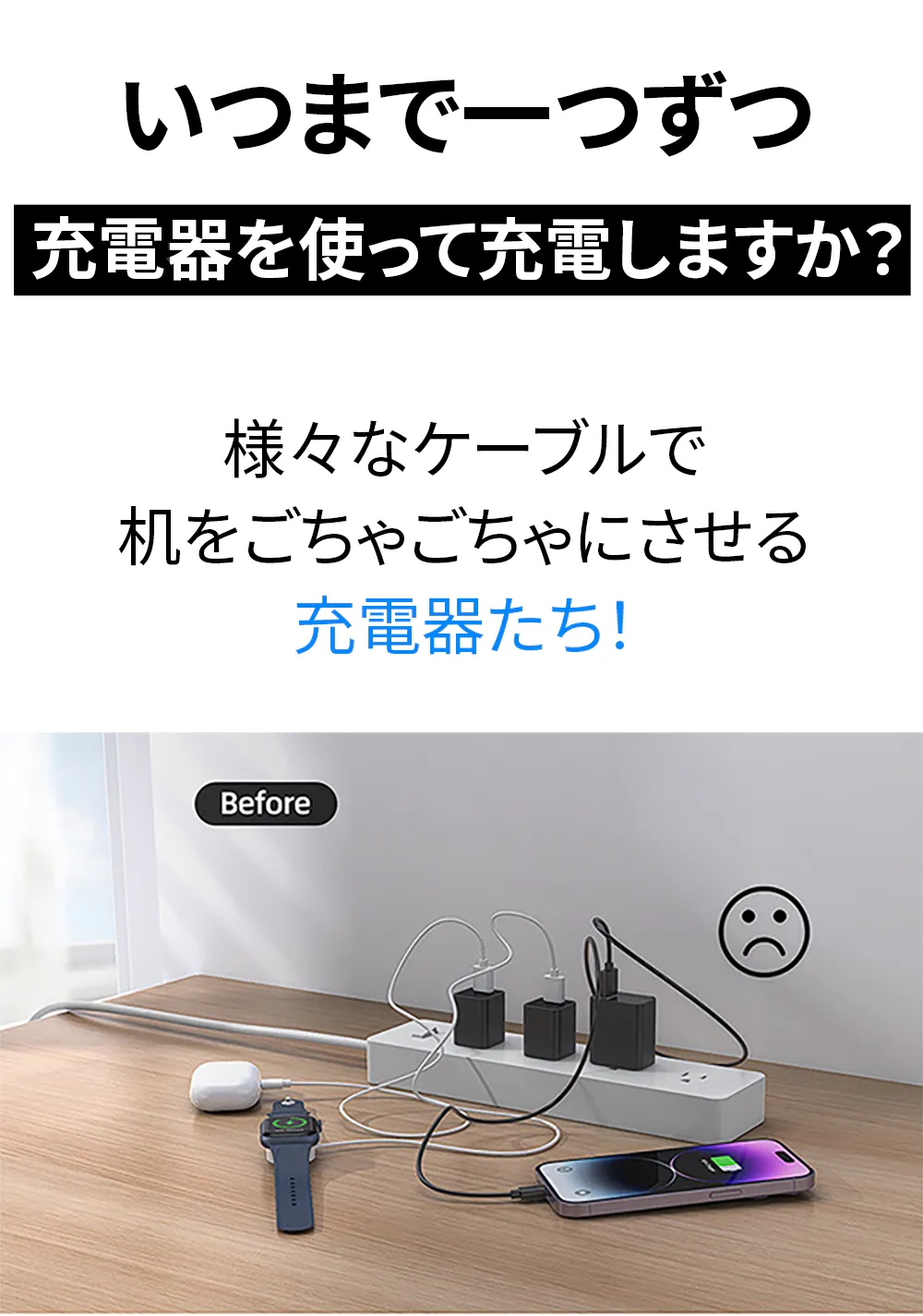 出張や旅行に出かける時、スマホ用、イヤホン用、ウォッチ用の充電器を3つ持って行ったり、ケーブルを3つ持って行ったりする必要がありません。