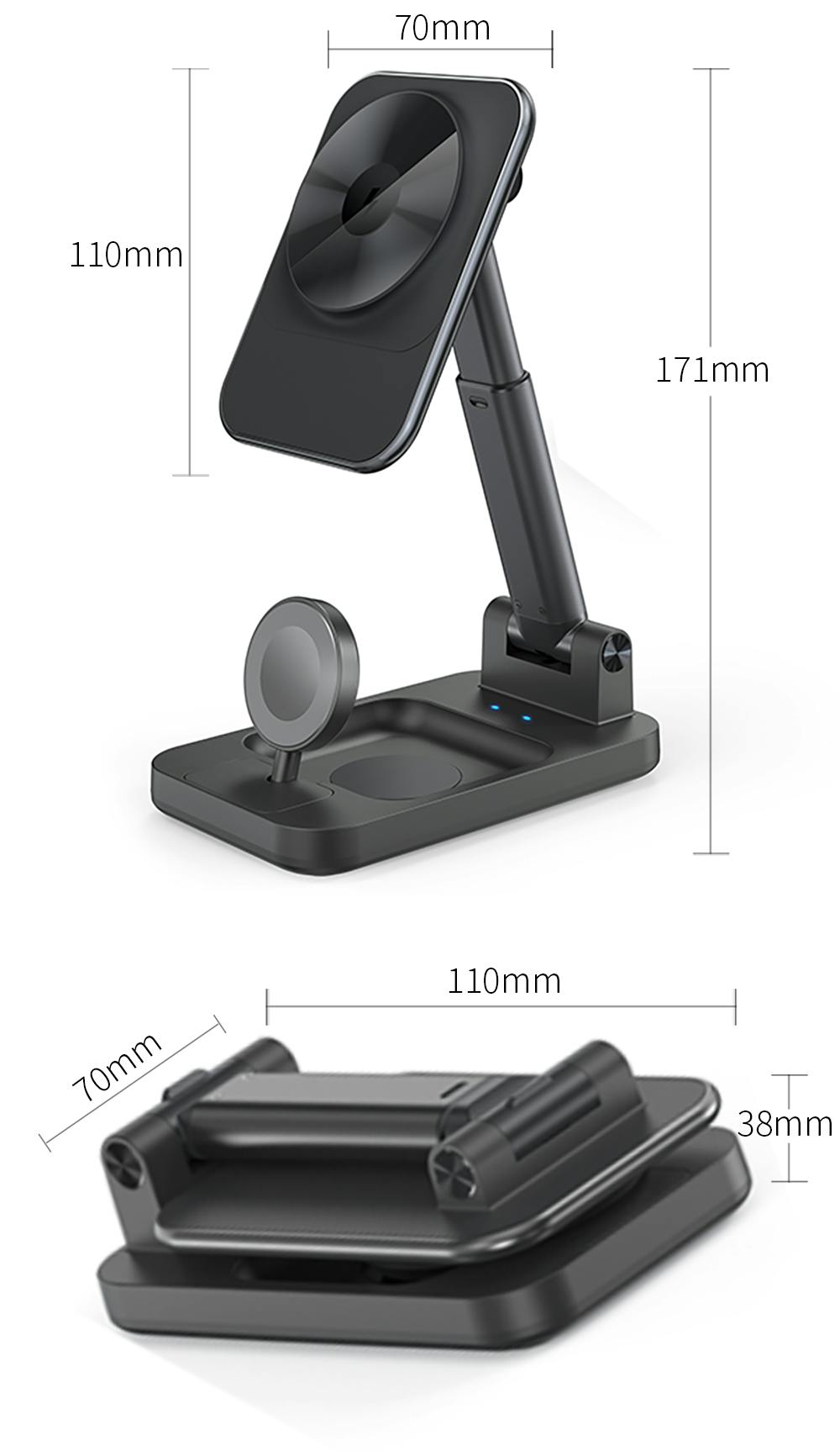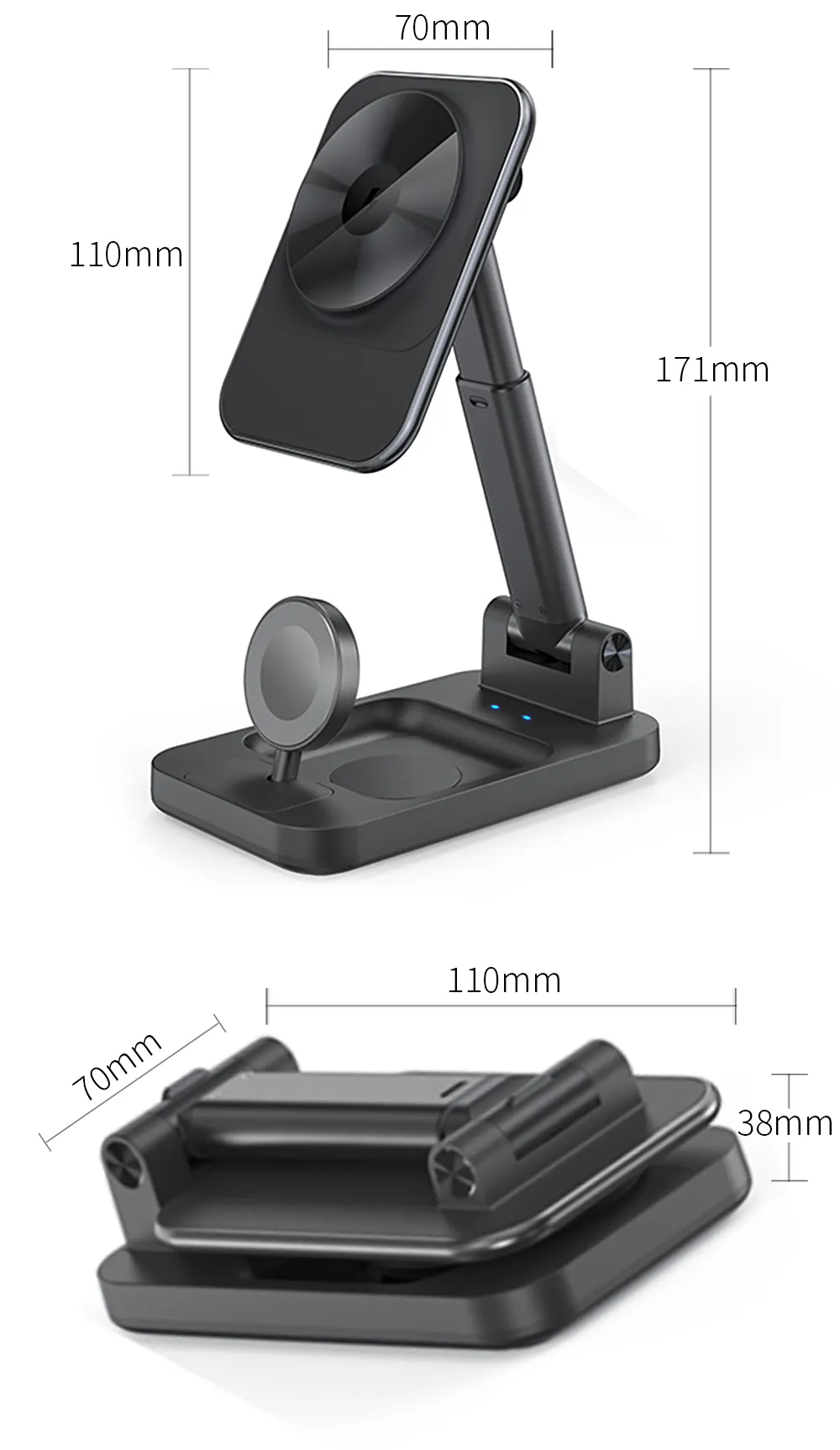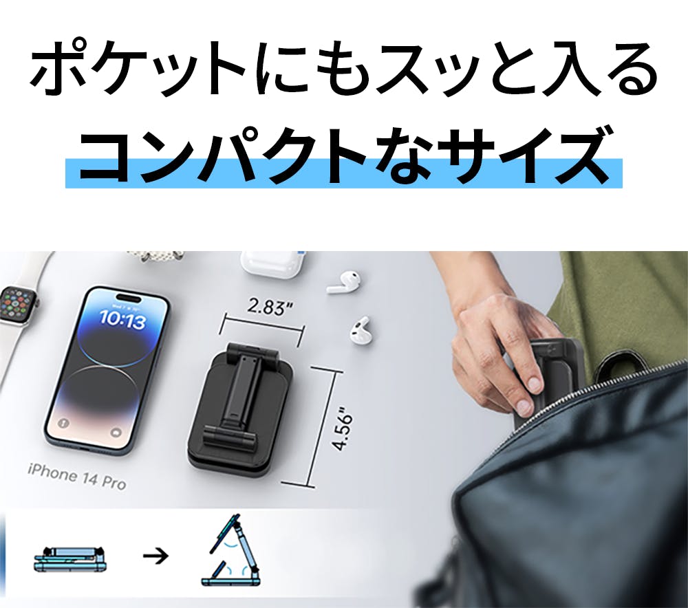 スマホ充電部分は土台と同じサイズで、ウォッチ部分はイヤホン充電部分に収まるので、コンパクトに折り畳むことができます。