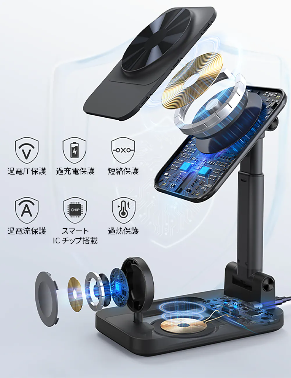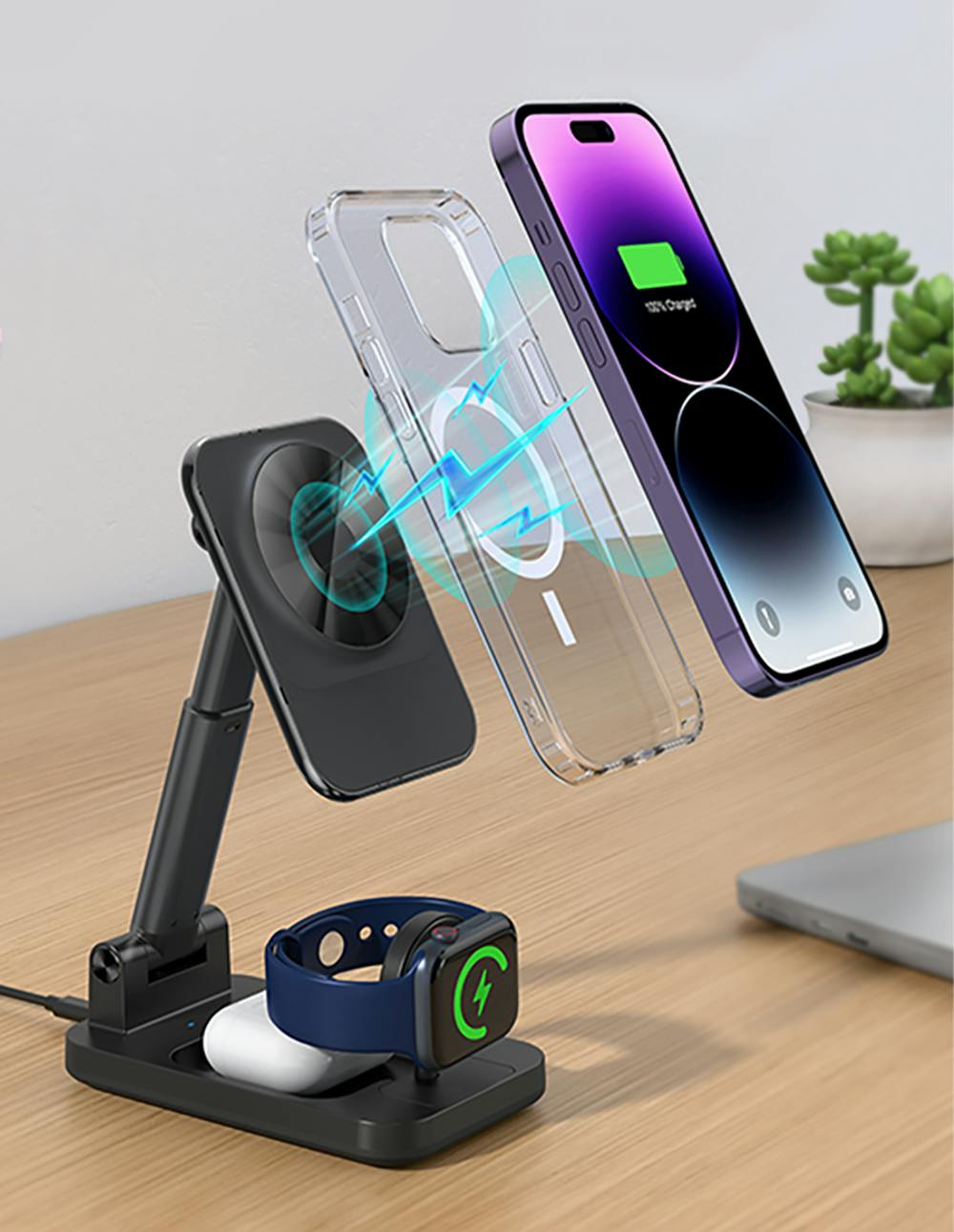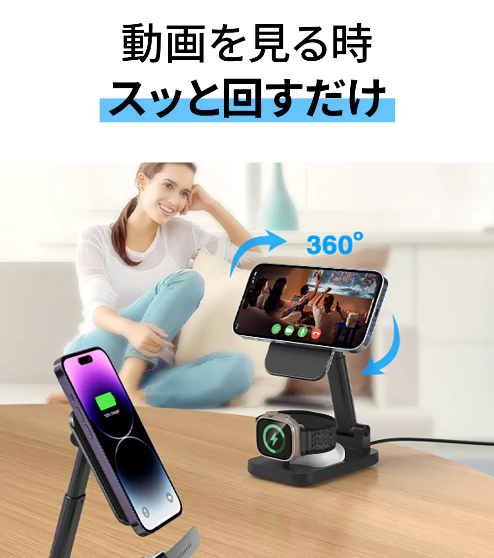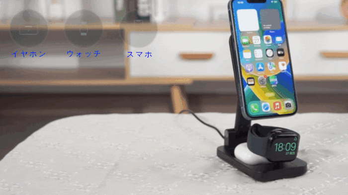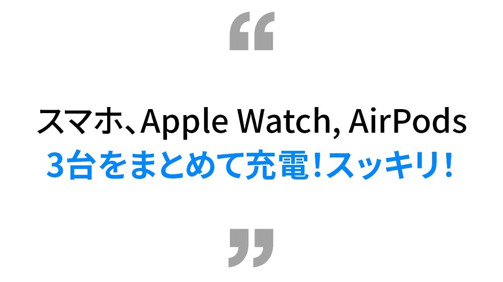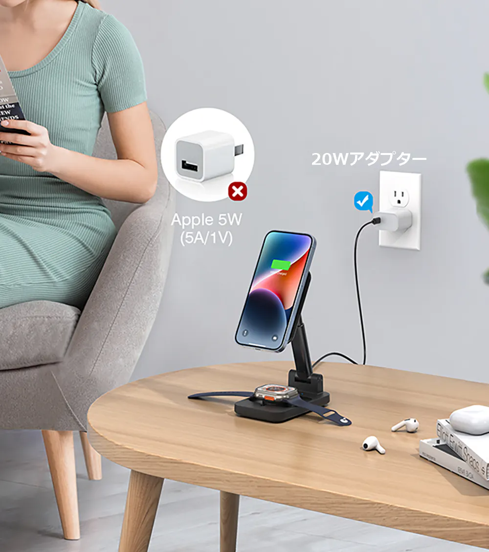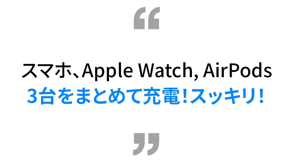 スマホは15W急速充電でき、ウォッチやイヤホンも一緒に充電させられるので、アダプターがコンセントを占領しなくなります!