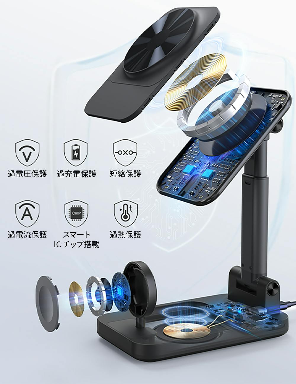 過電圧、過充電、過電流、短絡、過熱を防止する