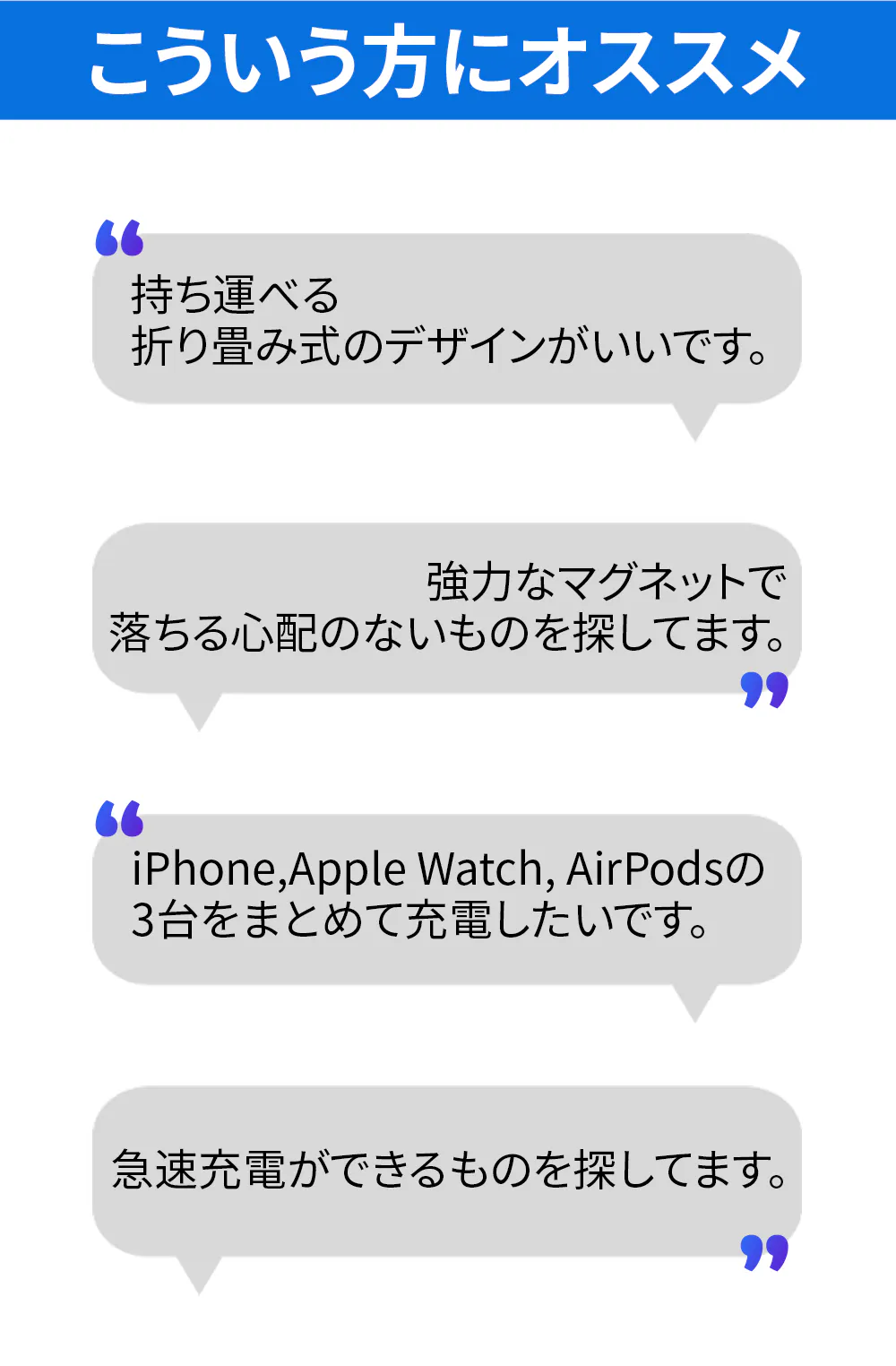 今やスマホとイヤホン、ウォッチを持ち歩くのが当たり前になって、会社でもイヤホンやウォッチの充電を行ったり、出張や旅行先でも3台同時充電が必要になることもあると思います。3in1充電器は折り畳むことができるので、これ一台をバッグのポケットなどにスッと入れて持ち運べば、ケーブルとアダプターを何個も持ち運ぶ必要もありません。