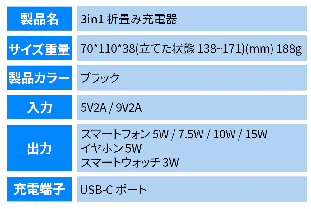 今回ご紹介させていただいた、3in1折畳み充電器はスマホからウォッチ、イヤホンまで3台を同時に充電できる充電器です。スマホとワイヤレスイヤホンはマストで持ち運び、ウォッチも使用している方々が多くなりました。そのため、充電するものが増えケーブルを何本も持って行って絡まったケーブルをほどいていたりした経験ありませんか。「3in1折畳み充電器」があれば、一本のケーブルで対応できるので、ケーブルが絡まるのから解放され、テーブルがごちゃごちゃにならずスッキリします。