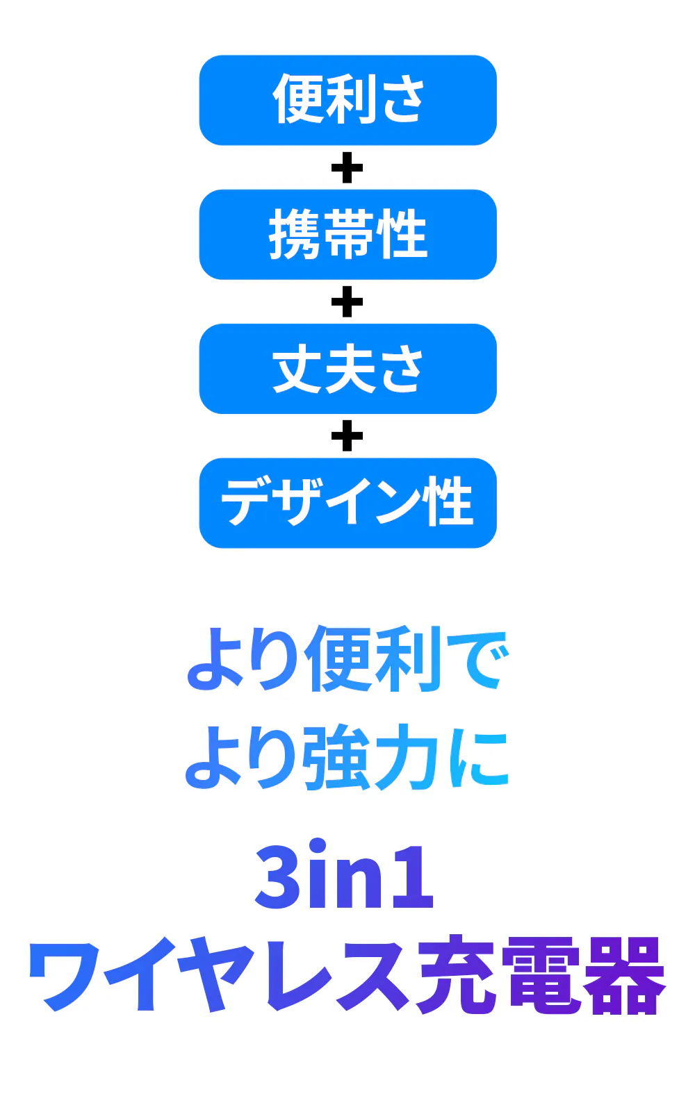2024/04/02 15:30こんにちは。ヤベツインターナショナルです。今回のプロジェクトはスマホ充電器 + イヤホン充電器 + スマートウォッチ充電器の3つの充電器が一体化した「3in1折畳み充電器」になります。【ワイヤレス充電】ケーブルを挿す必要なく、スマホも、イヤホンも、スマートウォッチも充電面に置くだけで、充電が開始されます。アダプター1個、ケーブル1本で3つのデバイスを充電できるので、デバイス別にケーブルを用意しておく必要がないので、デスクの上にケーブルが転がることがありません。また、スマホ部分は最大15Wの電力で急速充電ができます。【折畳み式】持ち運ぶ時、スマホ充電部分を折り畳むことができ、コンパクトサイズでバッグに入れやすいです。スマートウォッチ充電部分も折り畳めるので、イヤホン充電しない時はそのまま置いて充電したり、時計を確認するため立てて置きたい時は立てて充電することもできます。スマホ部分は角度調整だけでなく、高さ調整もできるので、充電しながらスマホで動画を見る時に別途でスマホスタンドを用意する必要がありません。【強力なマグネット】強力なマグネットで、充電中に落ちる心配もなく、動画などを見ながらスマホをタッチする時も落ちる心配なく使用できます。また、忙しい時や眠る前に充電部分を探す必要なく、充電面に近づくとピタッとくっつくので、より楽に充電をすることができます。製品について気になる所がございましたら、お気軽にお問い合わせください。また一人でも多くの方々に知っていただけるよう、SNSでの拡散などお力添えいただけますと幸いです。引き続き応援頂けますよう、よろしくお願いいたします。 もっと見る