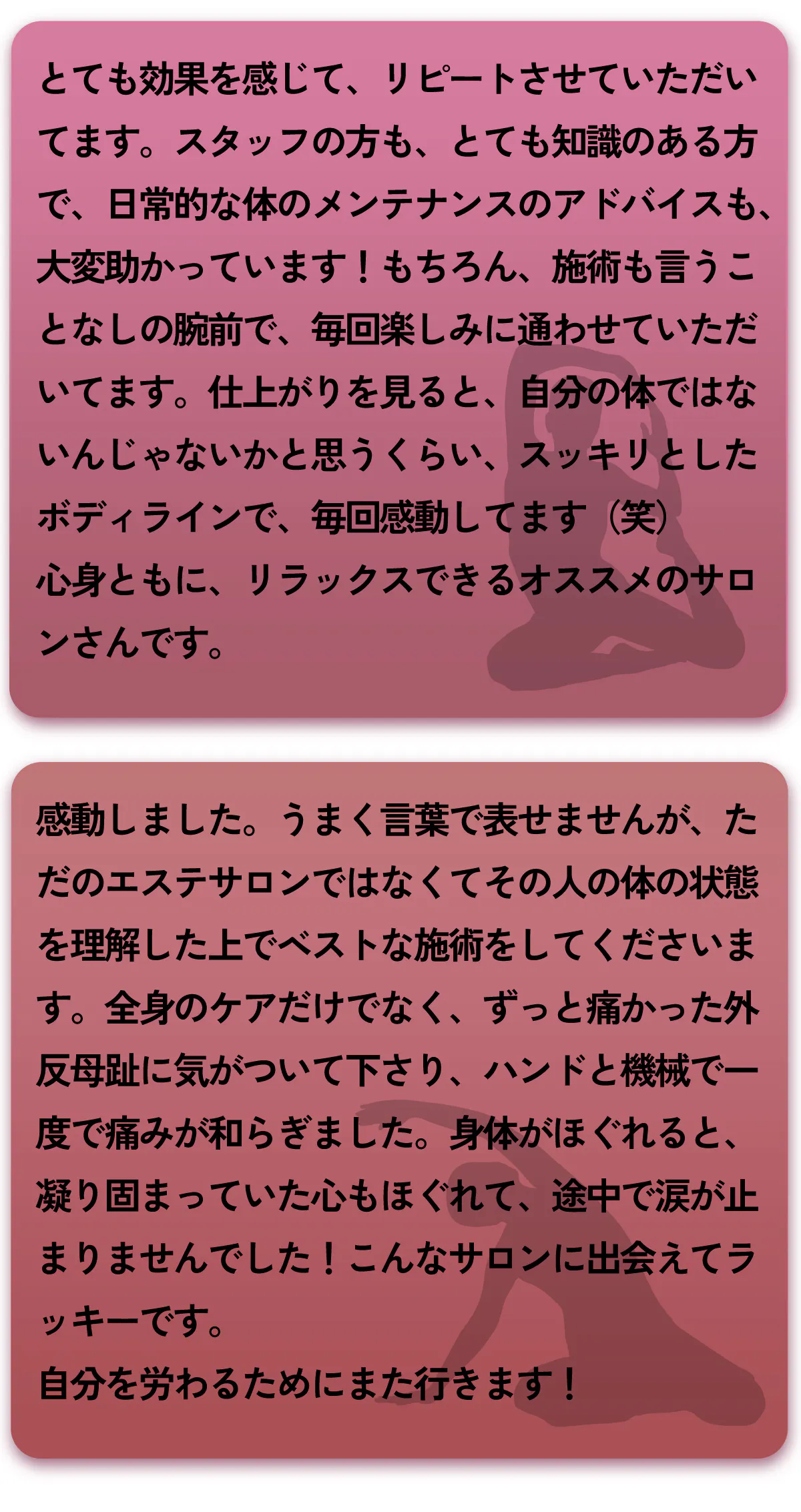 私の目指すエステは、単に外見を美しくするだけでなく、内側から健康になり、癒され、バランスがとれた美しい身体を手に入れる場所です。