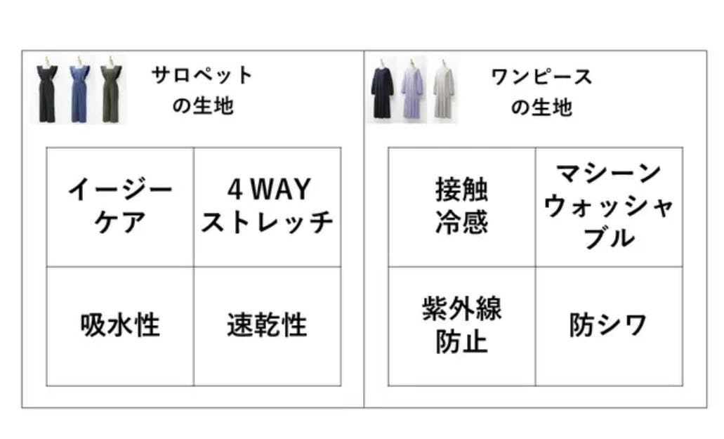 サロペットは、ストレッチと速乾性を。ワンピースは接触冷感と防シワ対策を。