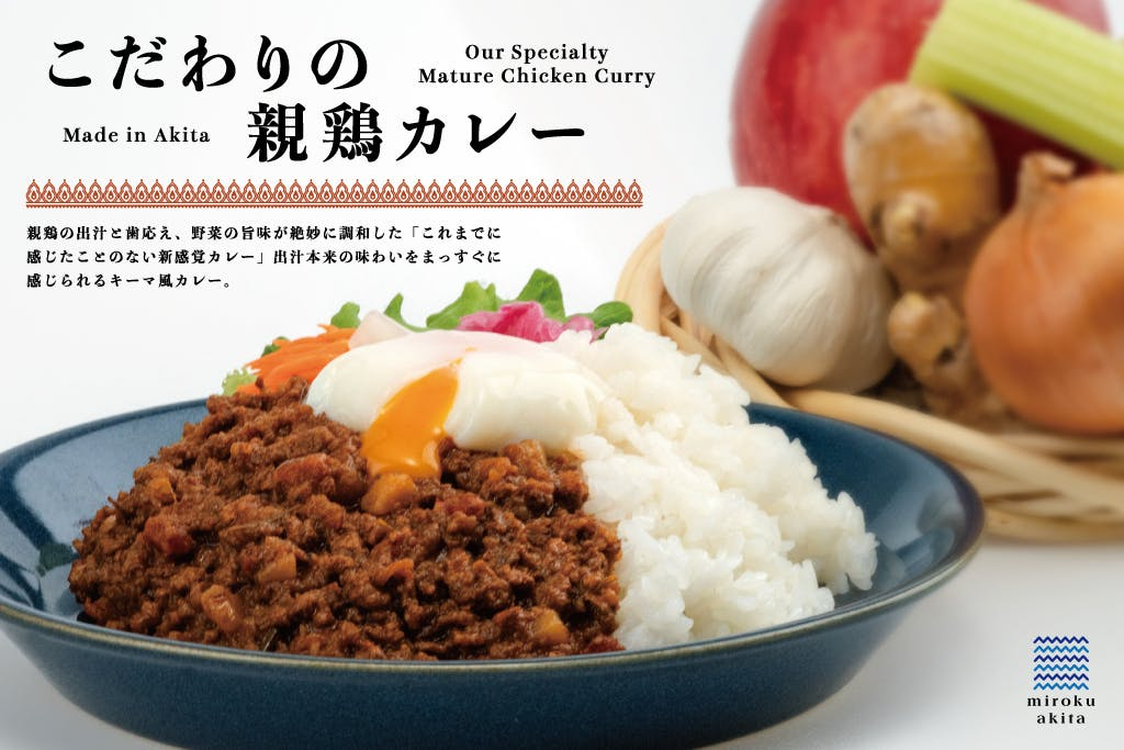 「秋田の魅力をぎゅっ♡と 」閉じ込めた新しいカレーです! 秋田県産高級たまご「黄身の余韻」の親鶏「こまち美鶏」の歯応えがあるしっかりとした鶏肉の新食感 !比内地鶏スープを加えた絶品スープ!東京・日本橋のイタリアン「アルポルト」ブランドの総料理長を務める末松充シェフがスパイス調合とレシピ監修! こんなぜいたくな秋田県美郷町発のカレーが完成しました。秋田の知られていない食材の使用と単純なブランド志向からの脱却…そしてフードロス、スローフードへの新しい取り組みです。 ご支援よろしくお願いします。