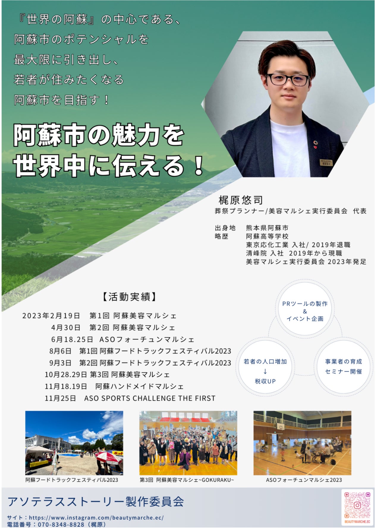 私は、熊本県阿蘇市出身、在住の梶原悠司(かじわらゆうじ)と申します。美容マルシェ実行委員会の代表として、阿蘇市内を中心にマルシェをはじめとした様々なイベント企画を通して、地方創生、地域事業活性化、町おこしの一助となるべく、日々活動しており、イベントで得た収益は、阿蘇市や団体へ支援しております。