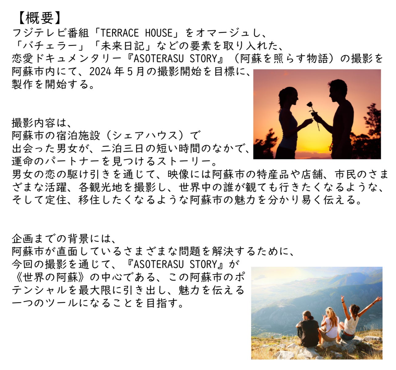 また、観光スポットの新規開拓と特産品や阿蘇市民の映像を通して、阿蘇市の魅力を視聴者へ発信し、観光客と移住、定住者の増加と税収の増加を目指す。
