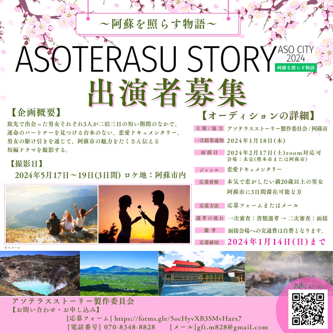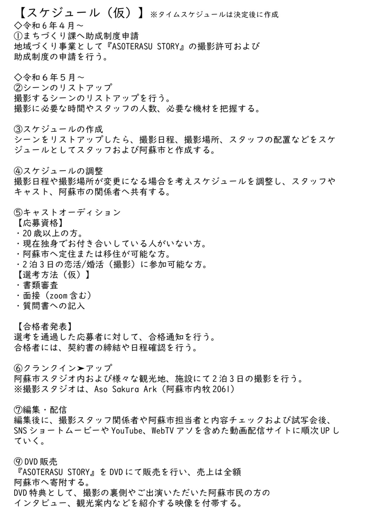 撮影前にはオーディションを行う。募集要項には将来的に阿蘇市に定住または移住可能な男女とし、直接的に阿蘇市の若者人口増加に繋げる。