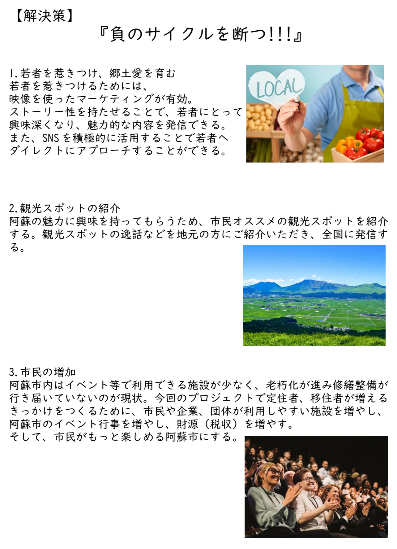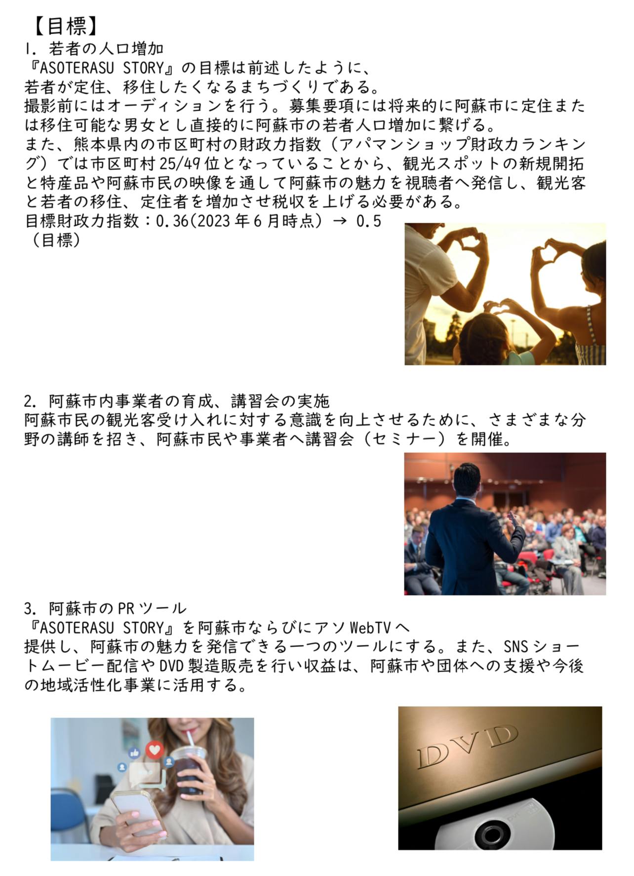 また、観光スポットの新規開拓と特産品や阿蘇市民の映像を通して、阿蘇市の魅力を視聴者へ発信し、観光客と移住、定住者の増加と税収の増加を目指す。