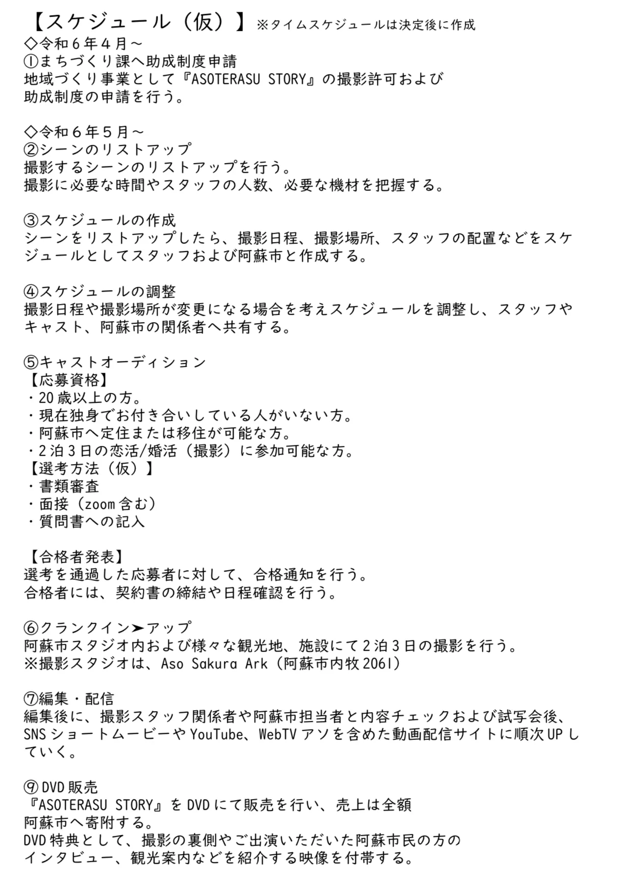 撮影前にはオーディションを行う。募集要項には将来的に阿蘇市に定住または移住可能な男女とし、直接的に阿蘇市の若者人口増加に繋げる。
