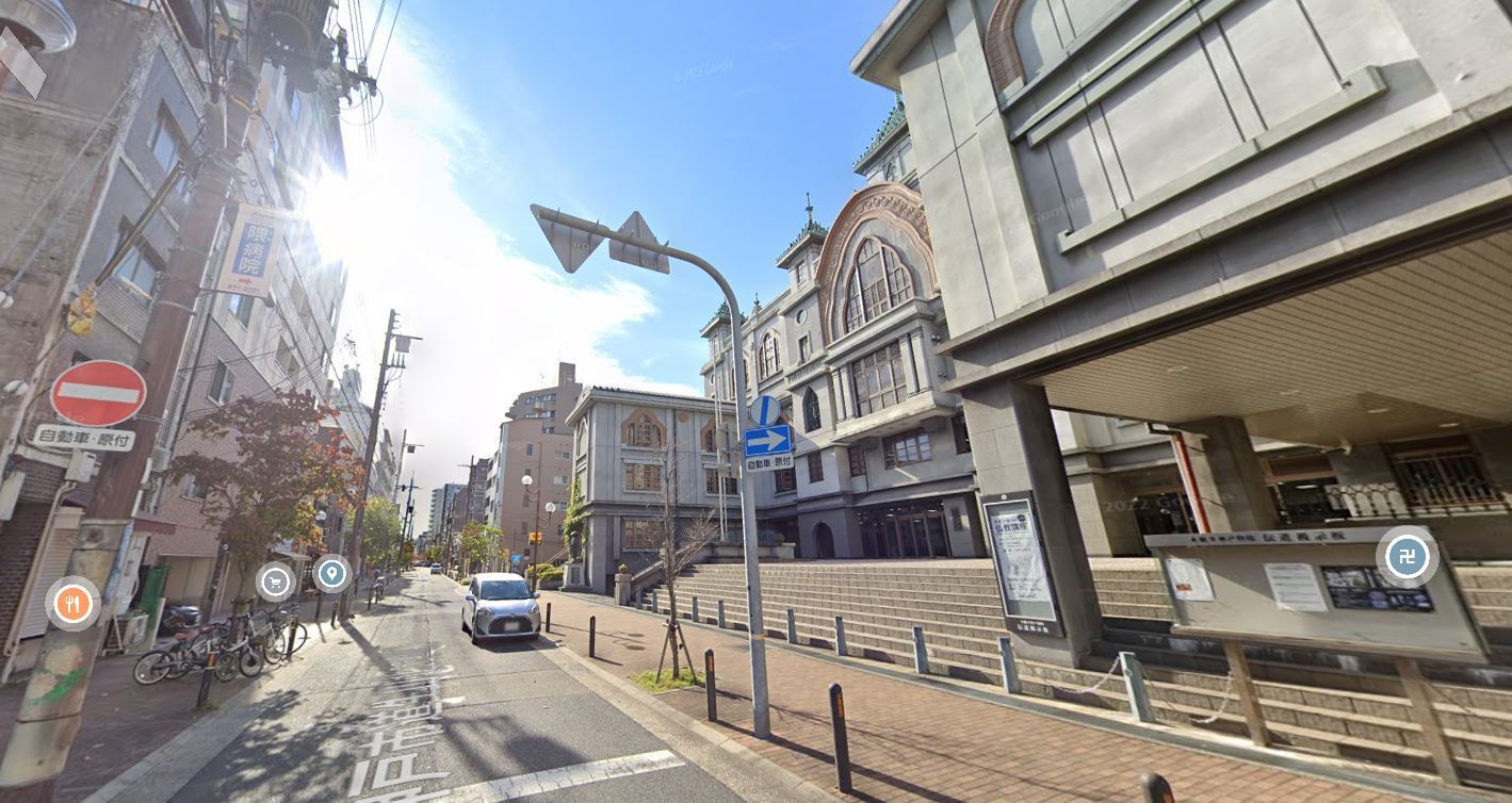 - 西口を出て西へ。モダン寺正面、花隈モダン通り入り口。