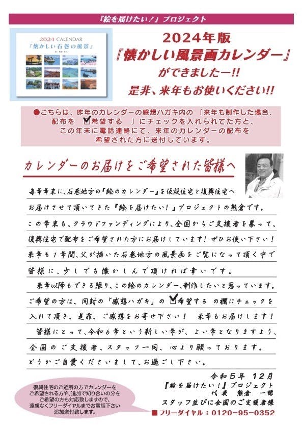 復興住宅の皆様へのカレンダー発送継続の方、先週、土曜日に完了しました。