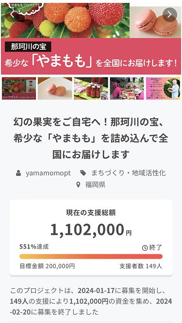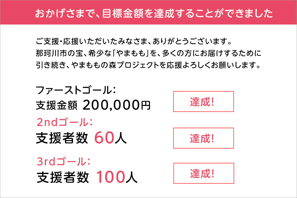 2024/02/21 08:00昨日2月20日(火)にて、クラウドファンディングが無事終了いたしました.おかげさまで、149人の方のご支援により1,102,000円の資金を集めることが出来ました。今回のプロジェクトを通して大変多くの方から暖かい応援のメッセージも頂くことが出来ました。本当に有難うございます。応援してくださった皆様、活動に協力いただいた皆様に厚く御礼申し上げます。「やまももの森プロジェクト」の一連の活動をより積極的に推進してまいります。今後ともご協力のほど何卒よろしくお願い申し上げます。 もっと見る