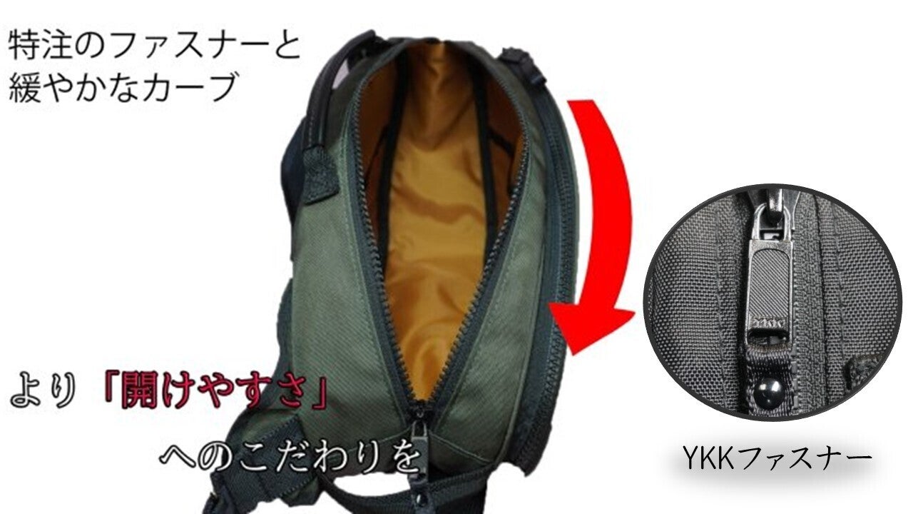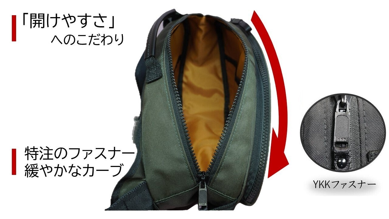試作を重ね、ファスナーの直線を保ちながら緩やかにカーブする形状を作り出すことにより、片手で簡単にファスナー開閉することを実現した。