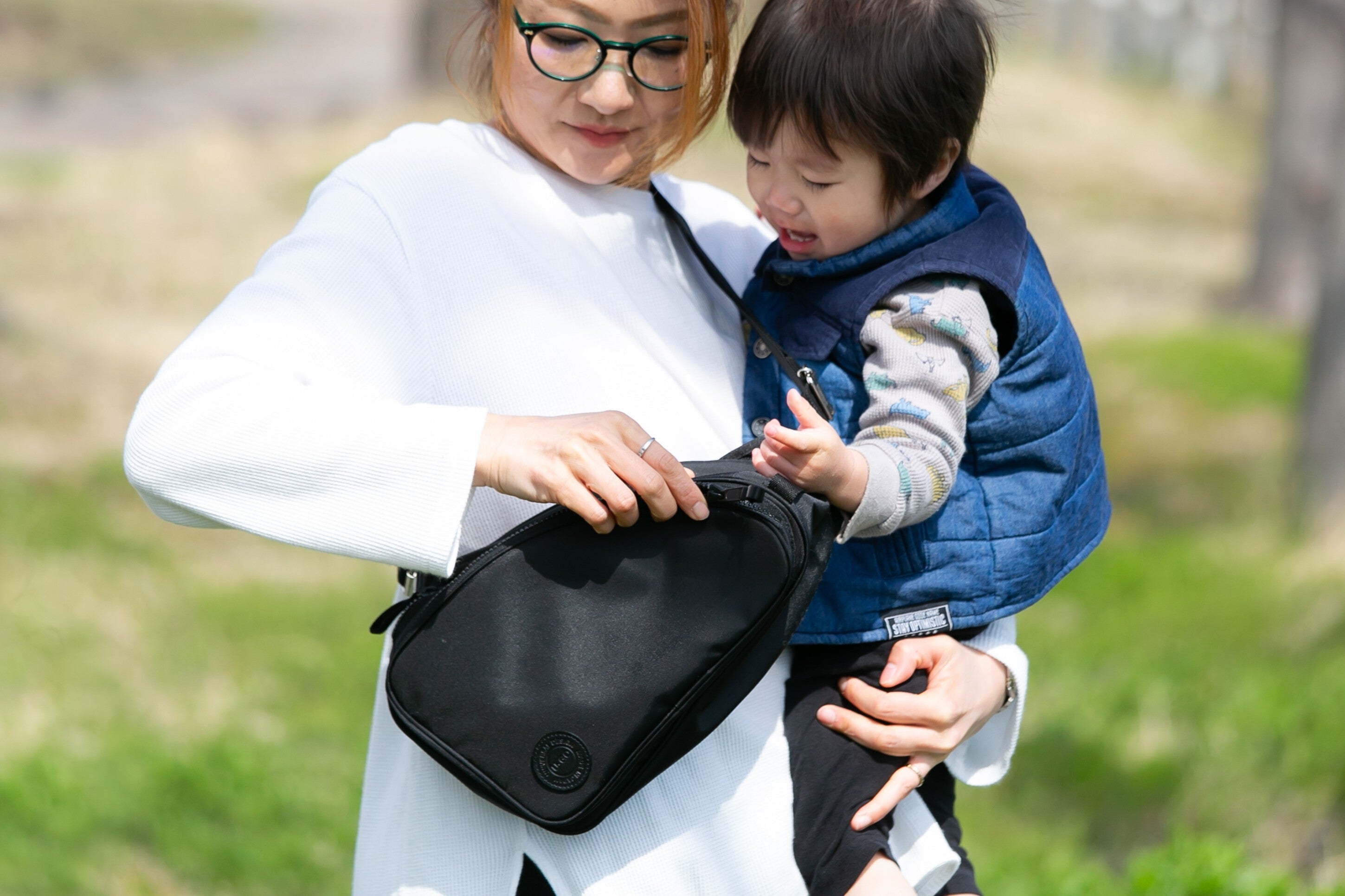 ・小さなお子さんを抱っこしているとき、どうしてもバッグを開けなければいけないことがありますよね。