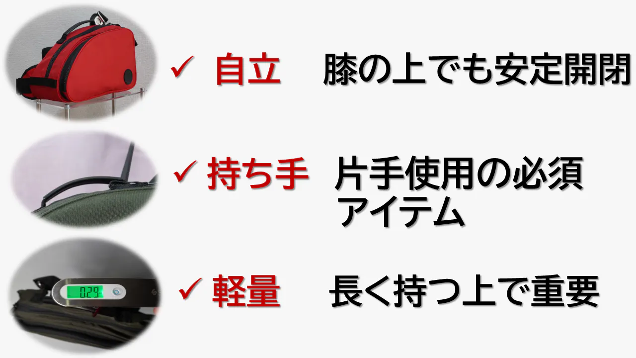 自立することにより、座った状態でも膝の上で安定してモノの出し入れをすることが出来ます。