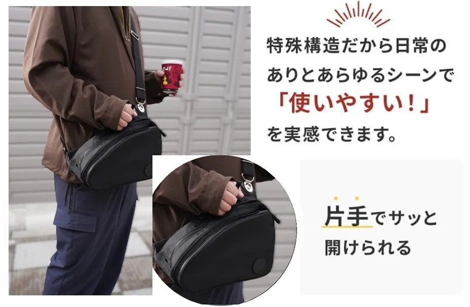 片手でより快適に使用できるバッグを目指し、日々開発しております。