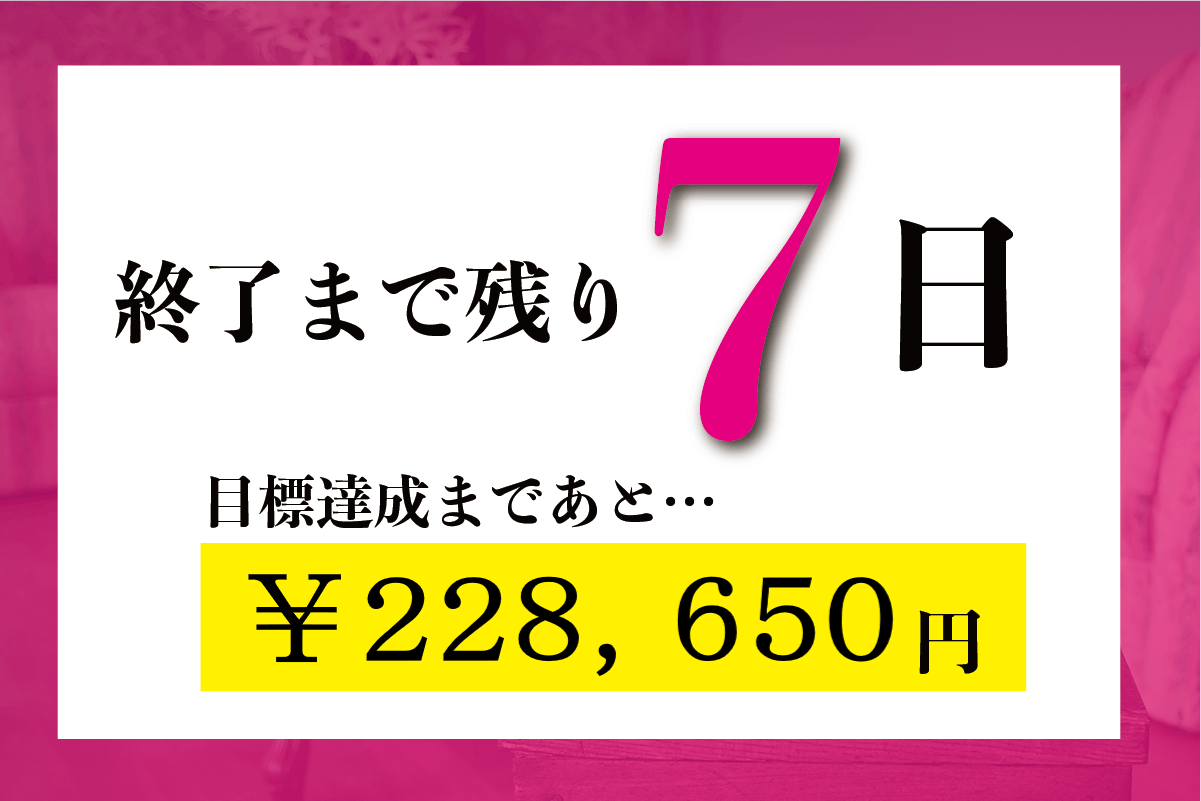 いつも応援ありがとうございます。早いものでプロジェクト終了まであと7日となりました!皆様のご支援のおかげでNEXT GOALまであと20万弱になりました。本当にありがとうございます。