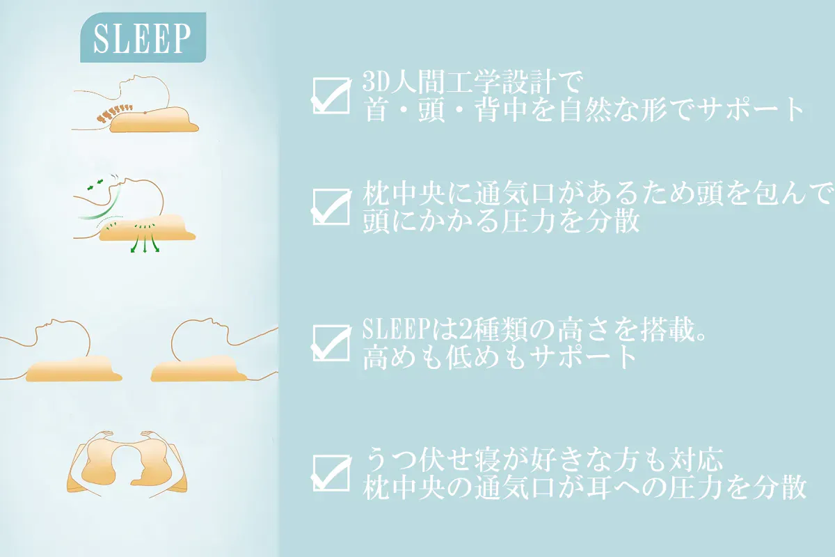 枕に困っている方のために生まれた「SLEEP」 には快適に睡眠できる設計が詰まっています。