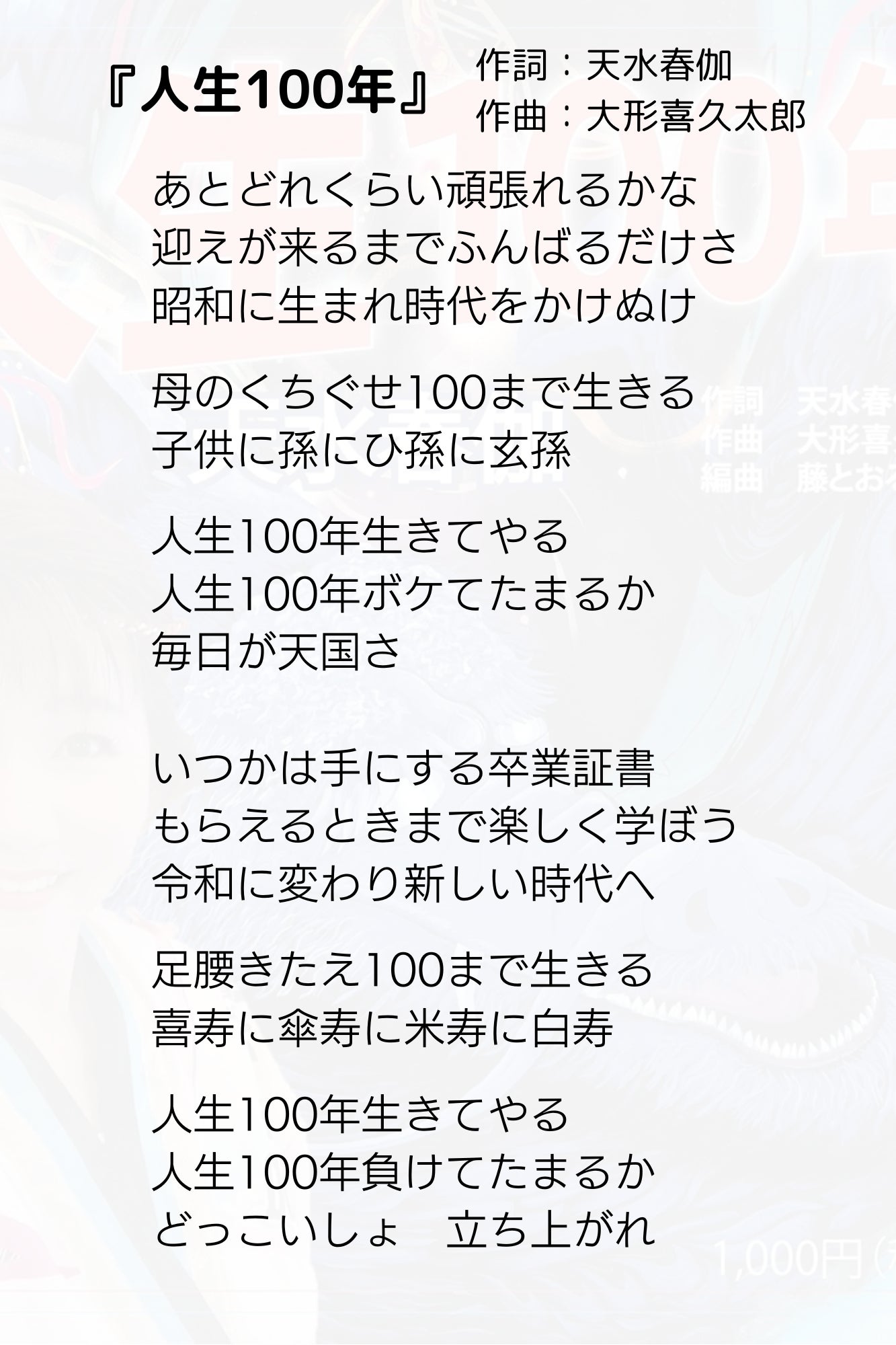 だからわたしは、母の口癖だったこの言葉を遺言だと思って引き継いで、100まで生きて、100まで歌うもりです。そういう意味では、この『人生100年』は自分自身を鼓舞する歌でもあります。