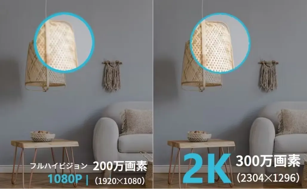 画質はコンパクト防犯カメラ製品に多いFHDや3MPよりもさらに高い、超高解像度2Kです。犯行現場は撮れていたけど、顔がぼやけていては意味がありません。顔までしっかりと映すことで、犯人の特定に結びつきます。