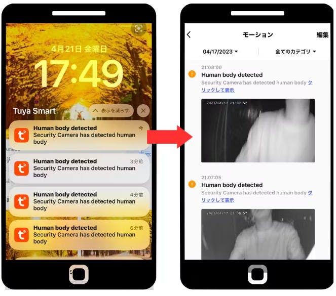 そのままフルカラーで録画を開始し、同時にスマホに通知します。警告音も手動で鳴らことができるので、不審者撃退に役立ちます。