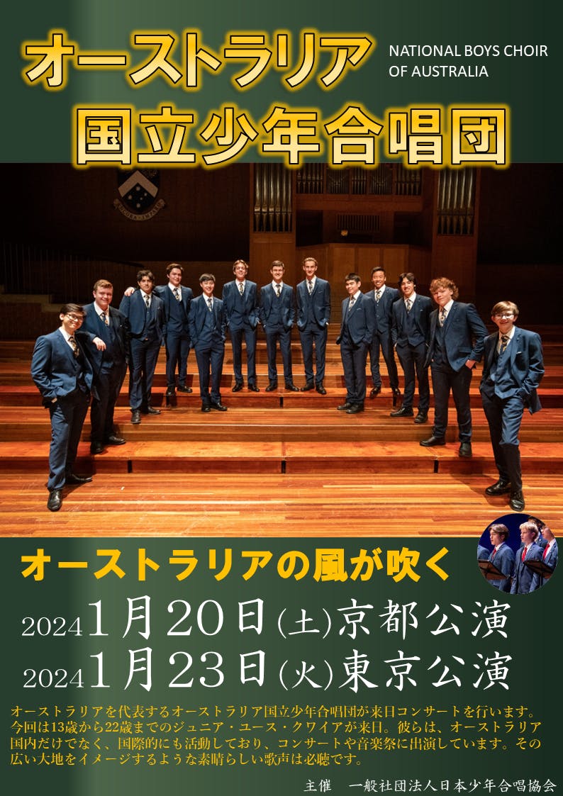 一般社団法人日本少年合唱協会と申します。今回、色々なご縁がありオーストラリアよりオーストラリア国立少年合唱団の来日公演の主催をいたします。ぜひご支援いただけますと幸いです。よろしくお願いいたします。