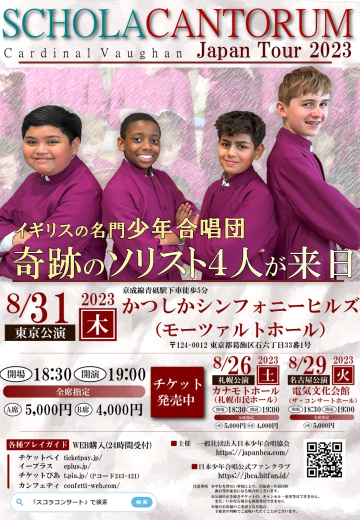 一般社団法人日本少年合唱協会はイギリスの名門少年合唱団、カーディナル ヴォーン スコラ カントラムの2023年来日公演を以下の日程で成功させました。今回の来日はイギリスのトップソリスト、マラカイ・バヨー君をはじめ、ソリスト4人を招聘できました。