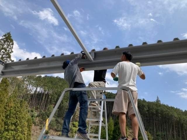 仲間の協力を得て、農業用倉庫を組立
