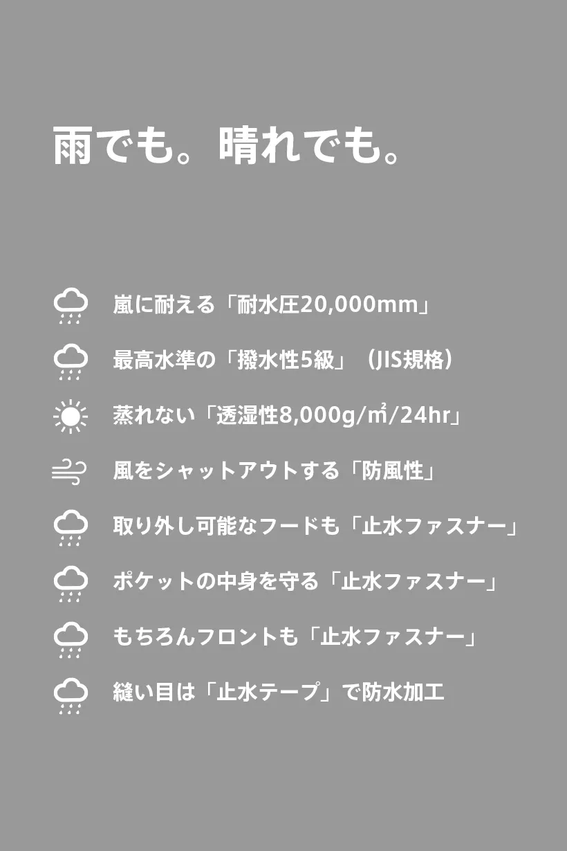 「耐水圧20,000mm」「透湿性8,000g/㎡/24hr」「JIS規格最高水準である撥水性5級」というアウトドアスペックの生地を使用しているだけでなく、「止水テープ」や「止水ファスナー」で細部まで防水加工を施しています。