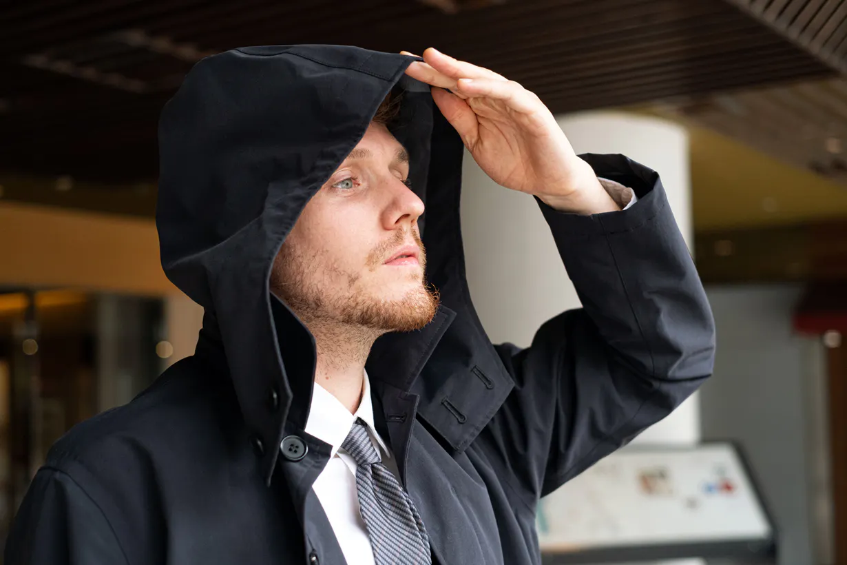 フードは「止水ファスナー」で脱着可能になっています。フォーマルなイメージで着たい時やフードがいらない時は外しておいて、雨が降った時やカジュアルなイメージで着たい時などはフードをつけて着ていただけます。