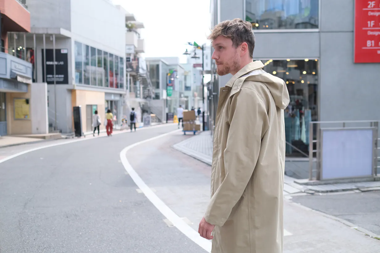 『All-weather Balmacaan Coat|BANNOU』も伝統的な「バルマカーンコート」の特徴を持ちつつ、フードなど現代的なアレンジや高い機能性を持たせたデザインになっています。