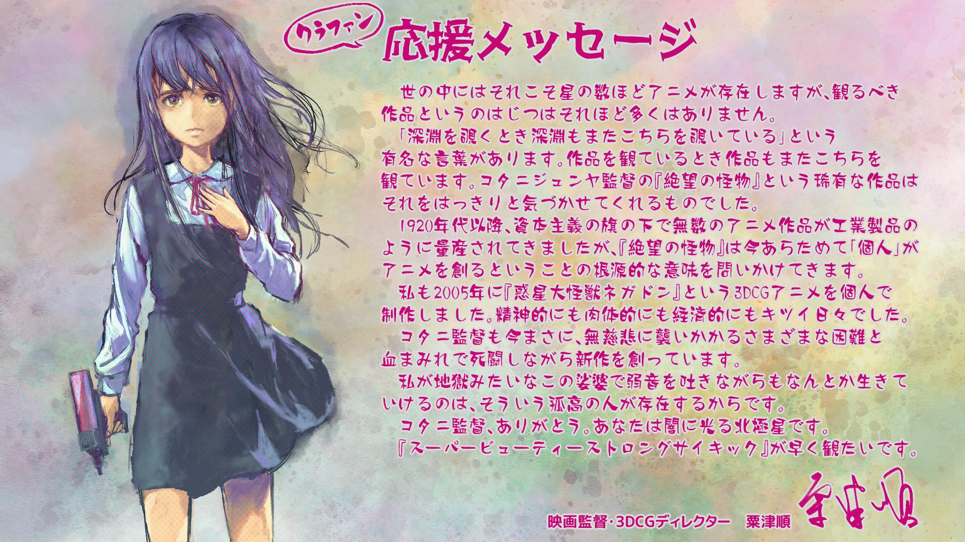 映画、アニメ業界はシビアで現実的な世界で、私は門前払いをされて、トボトボと帰る毎日です。それでも時折、私を応援してくれる人に出会います。時間がかかるかもしれませんが私は作品を完成させることが出来ます。そして出来た作品は面白いものになると思います。私は作家なので作品が全てです。いつか大きな映画館を満員にしたいです。