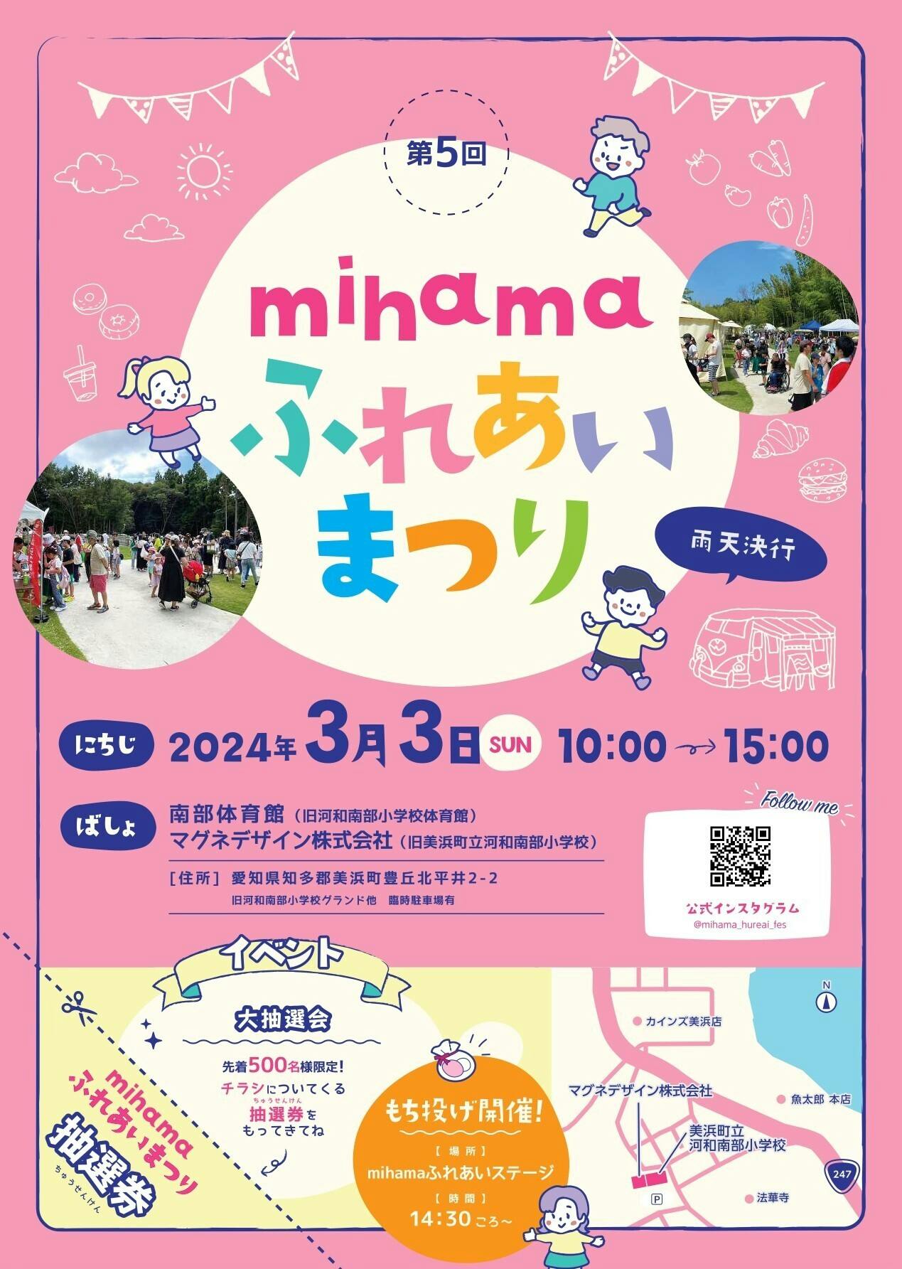 手作り感溢れるゲームコーナーや、地域特性を取り入れたワークショップ、地元の食材の採れたて朝市、その食材を利用したキッチンカーなど、美浜町を始めとする知多半島で活躍する企業や地域団体が参画するイベントです。ブース以外にもお楽しみ抽選会やもち投げなど、幅広い世代の方が楽しんで頂ける内容盛りだくさんです。