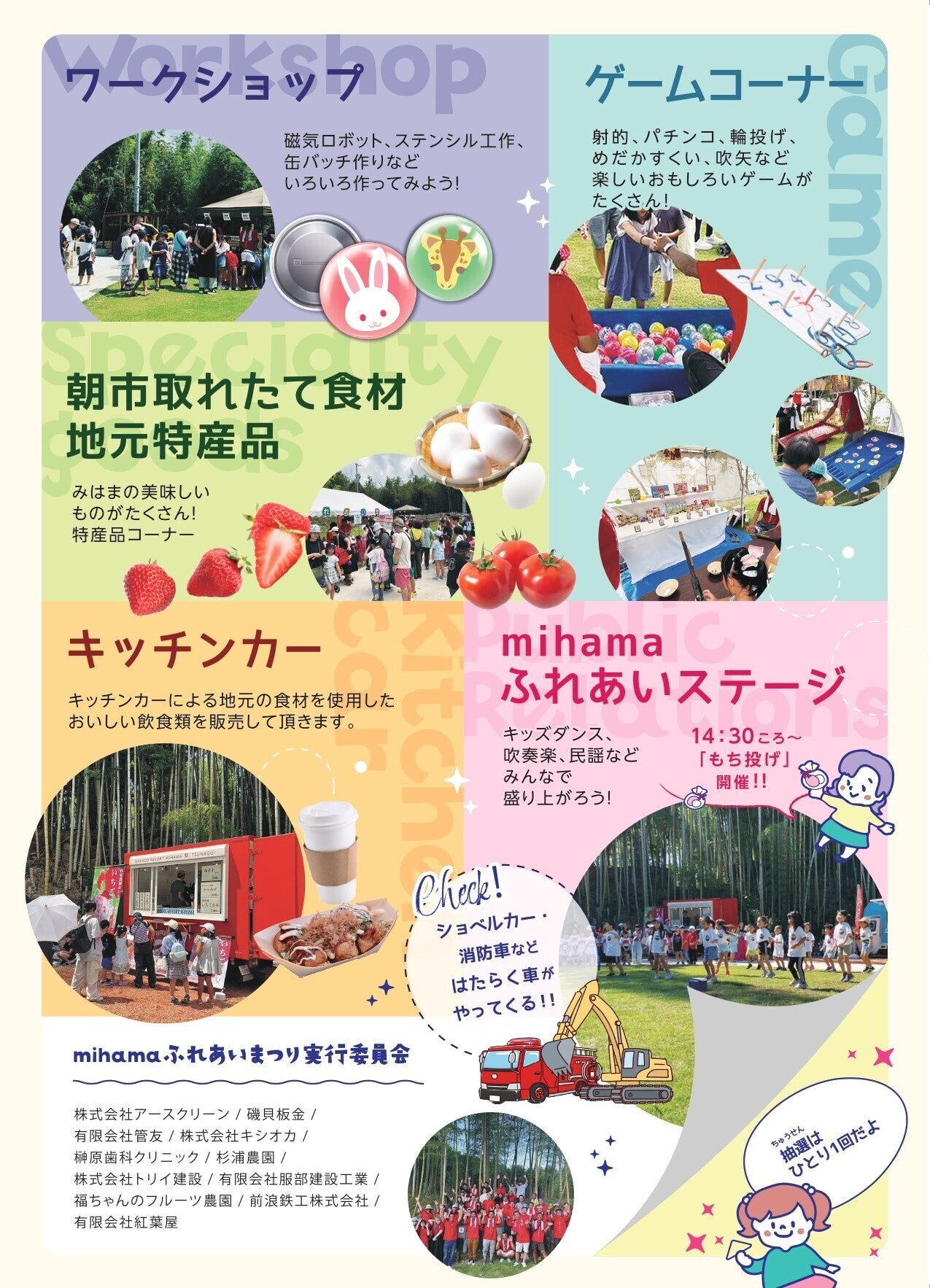 手作り感溢れるゲームコーナーや、地域特性を取り入れたワークショップ、地元の食材の採れたて朝市、その食材を利用したキッチンカーなど、美浜町を始めとする知多半島で活躍する企業や地域団体が参画するイベントです。ブース以外にもお楽しみ抽選会やもち投げなど、幅広い世代の方が楽しんで頂ける内容盛りだくさんです。