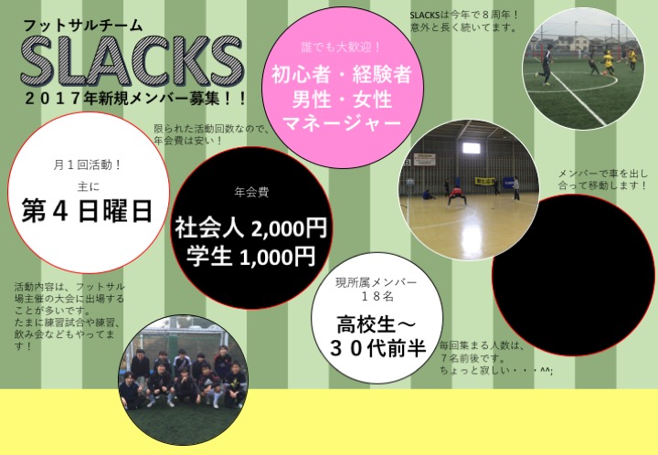 「SLACKS」は日本語で「ゆるい」という意味ですが、その名の通り、素人・経験者関係なくゆる〜い感じで活動しております。