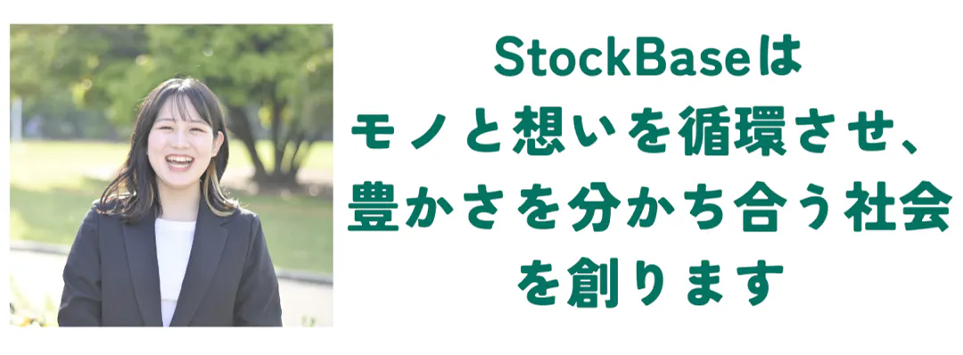 この社会から、「もったいない」という言葉をなくすのが、StockBaseの究極の目標です。まだ使えるものを捨てることって、もったいないと感じますよね。もし、まだ使える全てのものを別の形で使えるようにしていくスキームができれば、この社会から「もったいない」という言葉自体がなくなっていくと思うんです。そんな社会を目指しています。