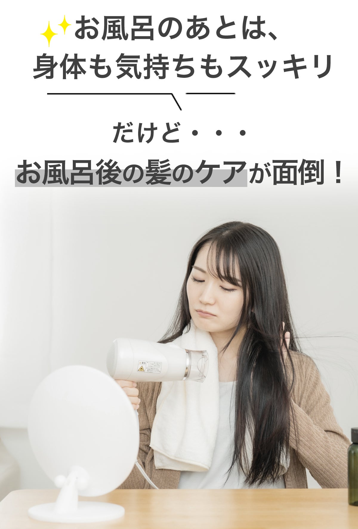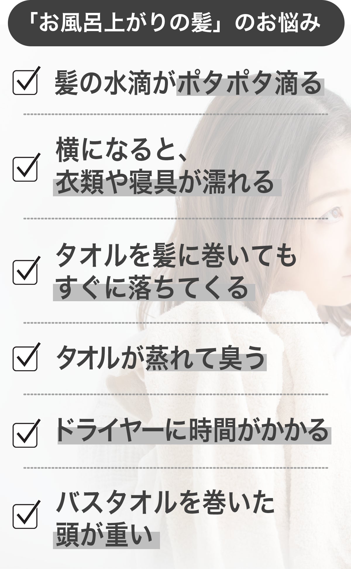 A、ヘアタオルに髪を押し当てるようにすると、水分がよく吸収されます。お試しください。
