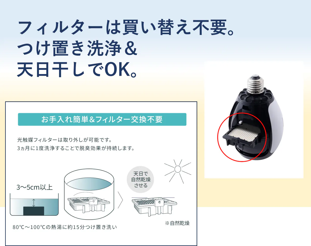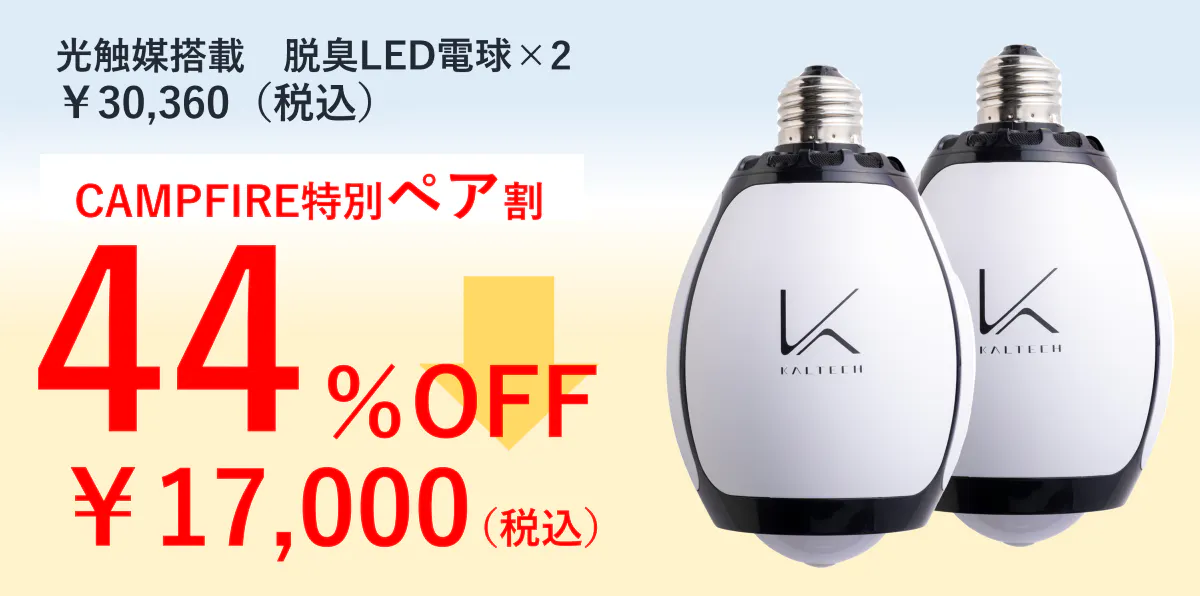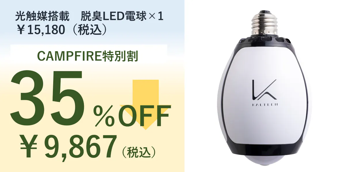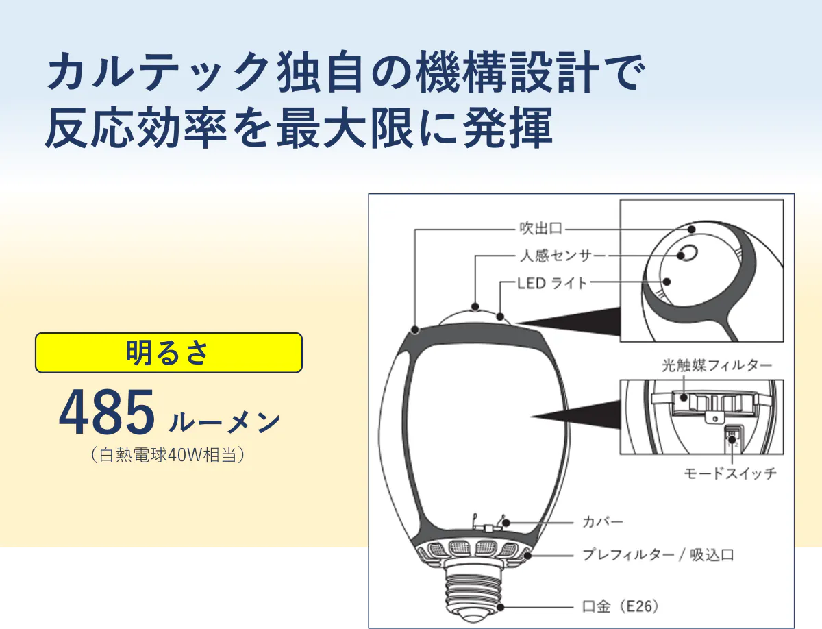 光触媒のカルテックが手掛けるLED電球。トイレや玄関などご家庭の小空間を強力脱臭します。
