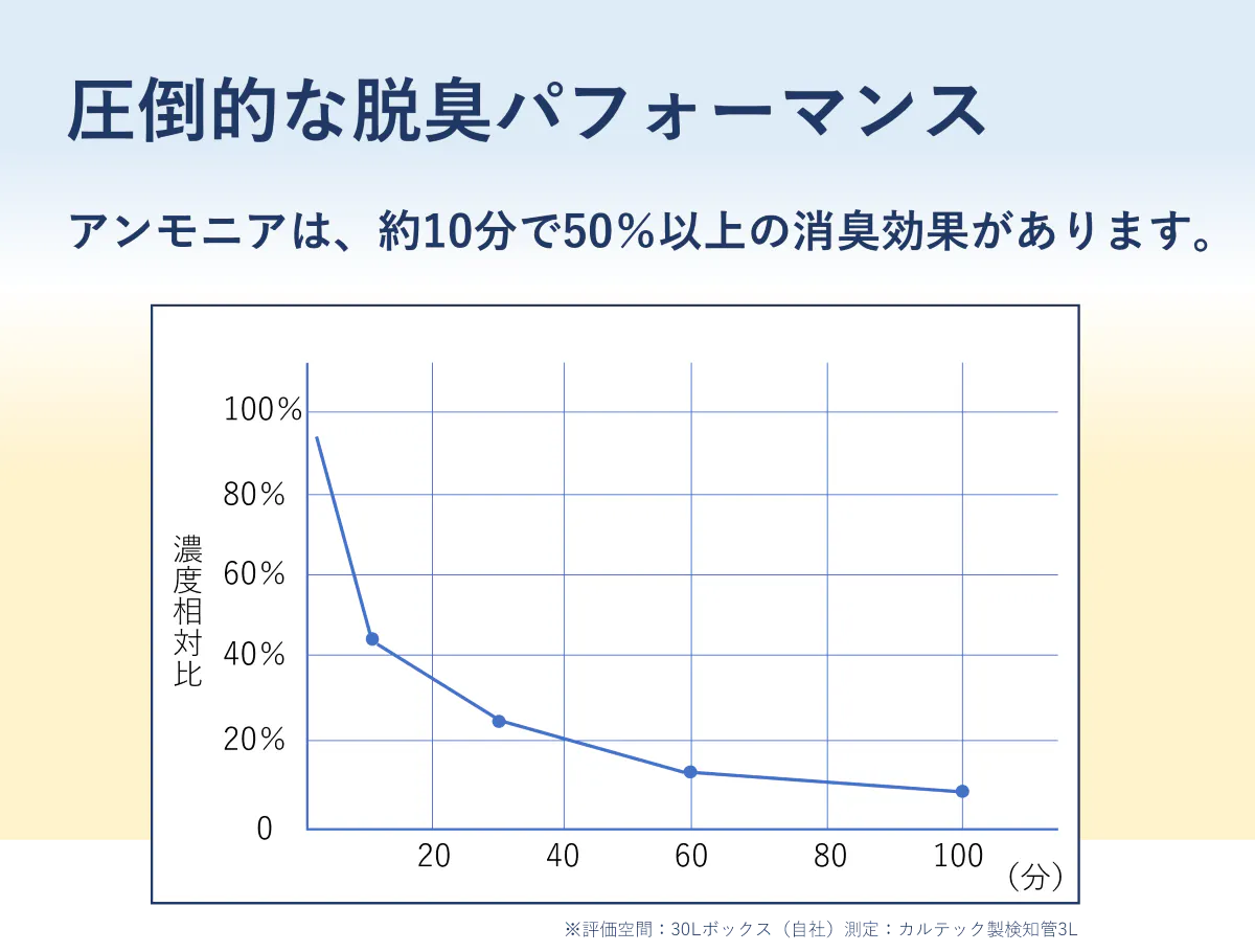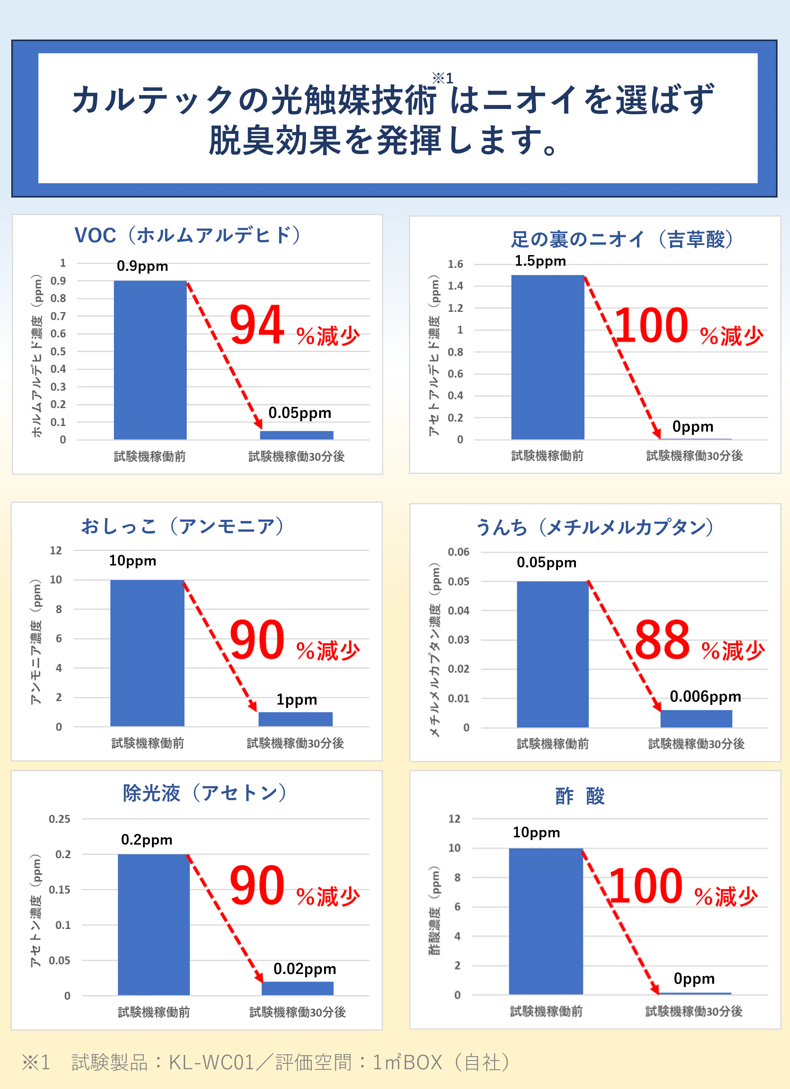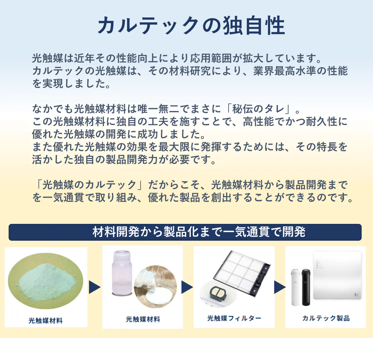 カルテック独自の機構設計で、反応効率を最大限に発揮!優れた光触媒材料の開発力とその反応率を限界まで向上させる製品開発力により、圧倒的なパフォーマンスでご家庭の小スペースの脱臭・除菌を実現します。