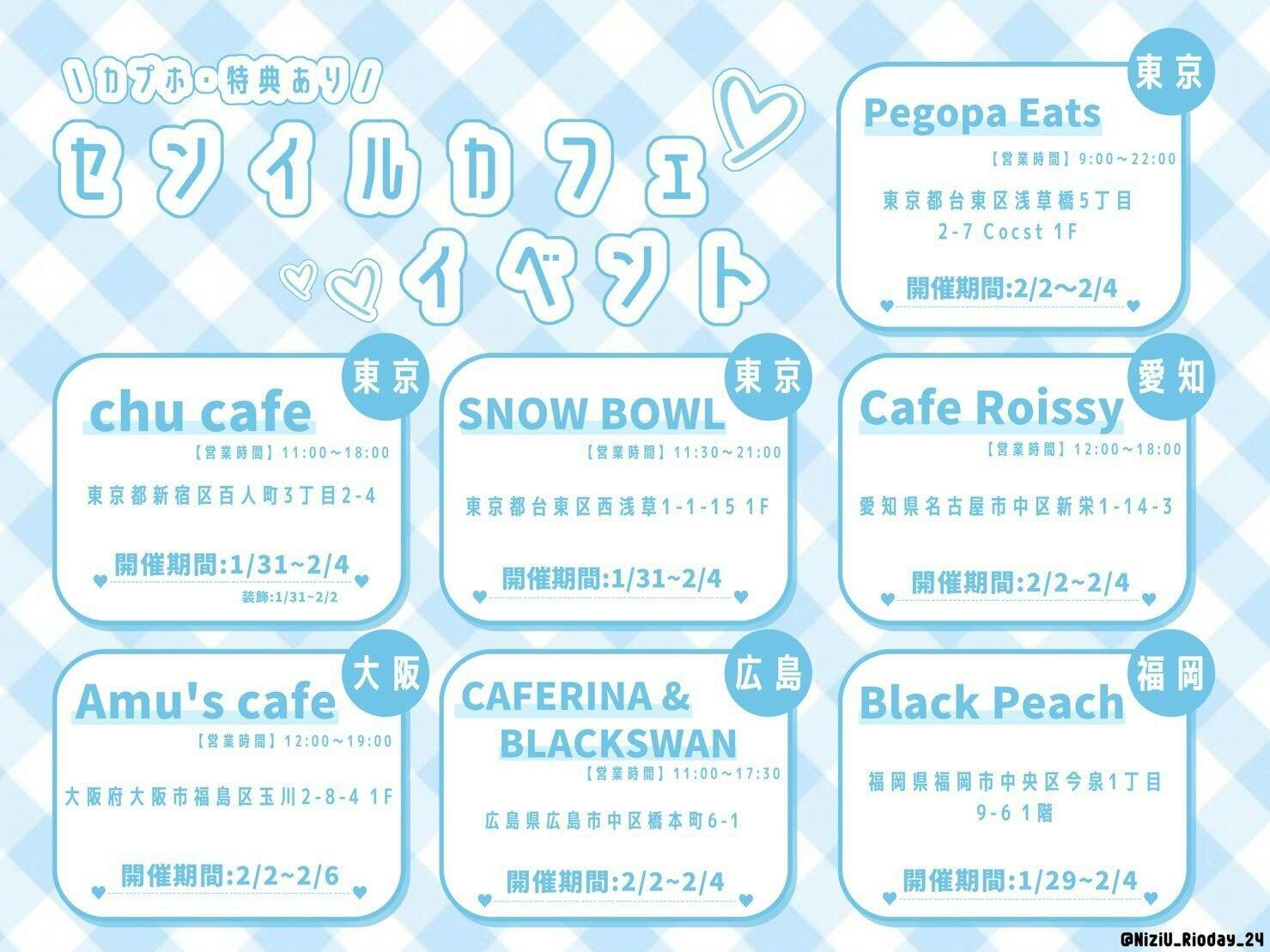 ご不明点ございましたら店舗様へのお問合せはご遠慮いただき、こちらのメッセージかTwitter@Niziu_rioday_24 までによろしくお願いします。