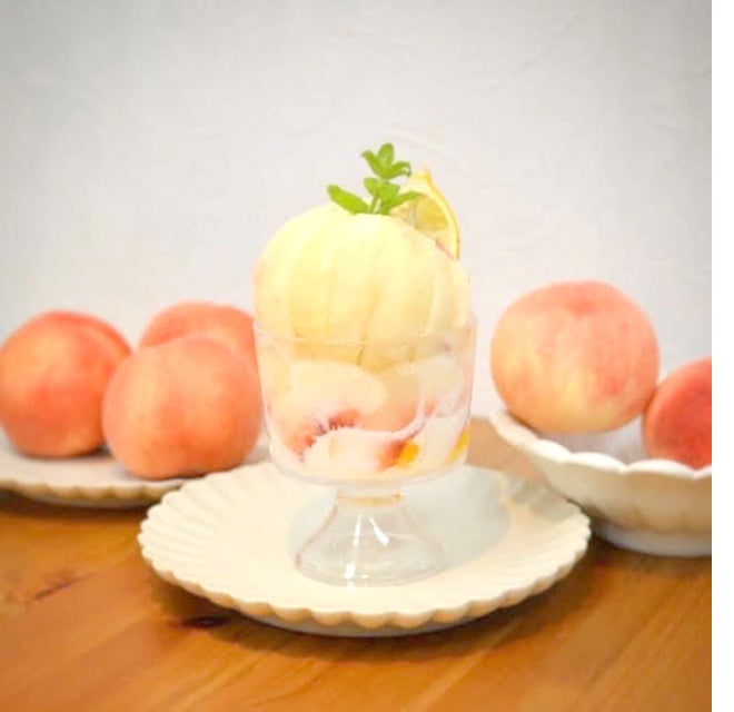 桃パフェネオは旬の丸ごと1個分の桃を使用し、桃の中に詰まった風の牧場ソフトクリームとの相性は抜群。